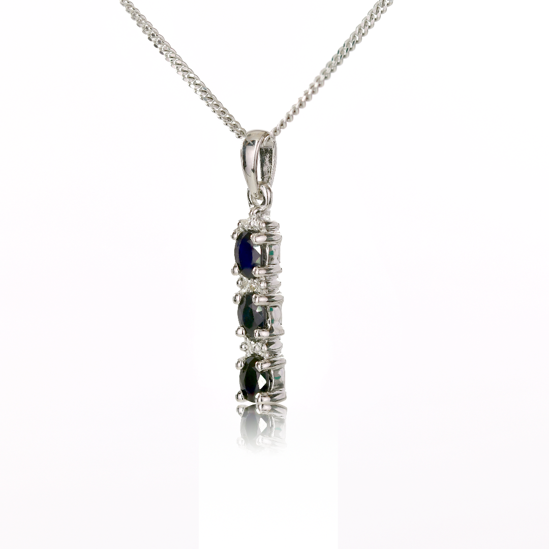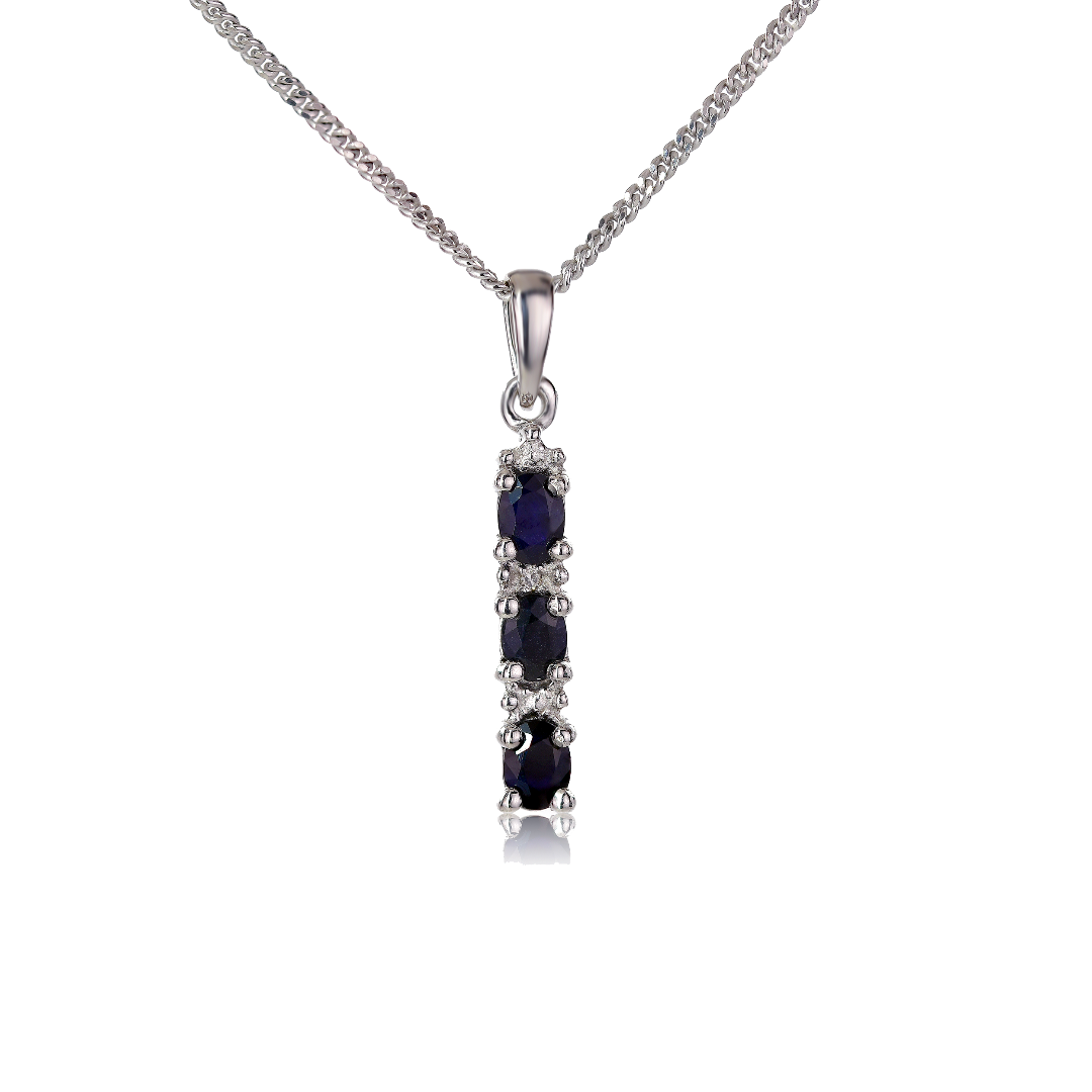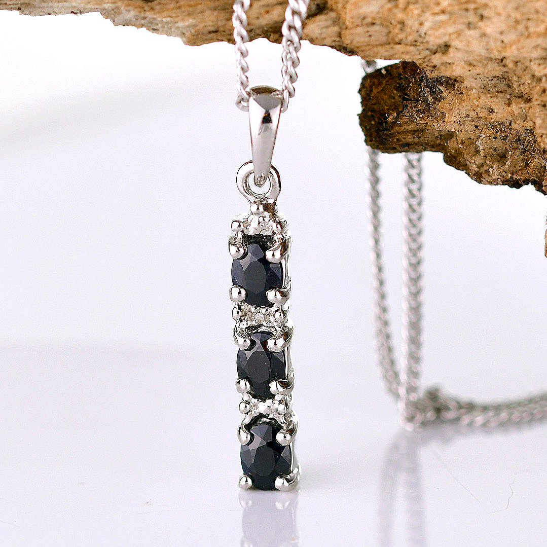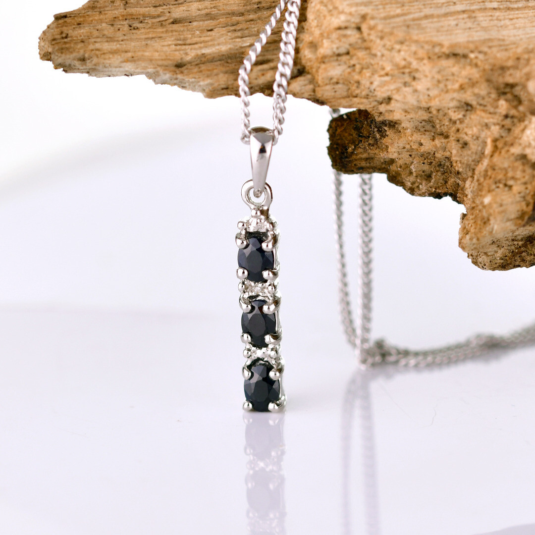 Elegant rhodium plated sterling silver 925 bar pendant set with a sparkling natural near colourless African diamond and natural Australian inky blue sapphires. Diamonds are associated with purity and perfection a symbol of light and brilliance. Sapphires are associated with purity and wisdom. They are the birthstone for September. This elegant pendant is suitable to wear for daytime or evening wear. It is supplied on an 18inch sterling silver chain. Both the pendant and chain are finished with a commercial grade rhodium plate to give a high quality shine finish. Supplied in an Ojewellery presentation box within a ribbon handled gift bag complete with product information authenticity card with space for a gift message and a jewellery cleaning cloth to keep your jewellery in ready to wear condition. It measures 24.4mm high by 3.8mm wide and the overall weight of the pendant is 1.2g