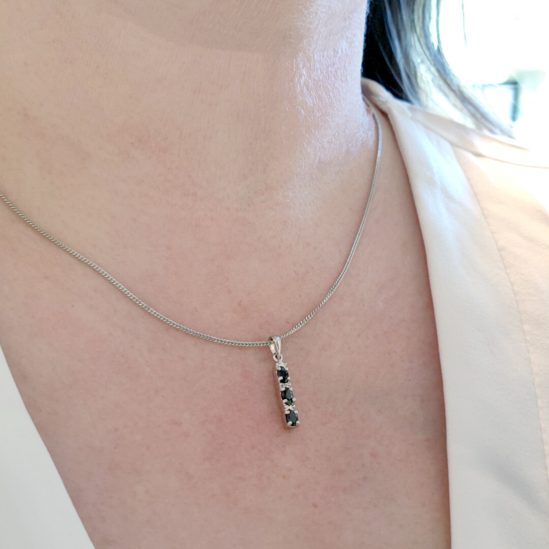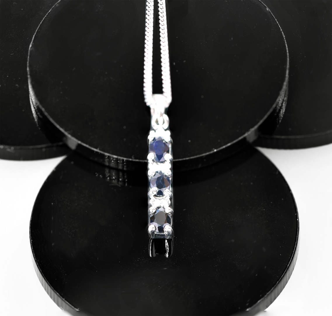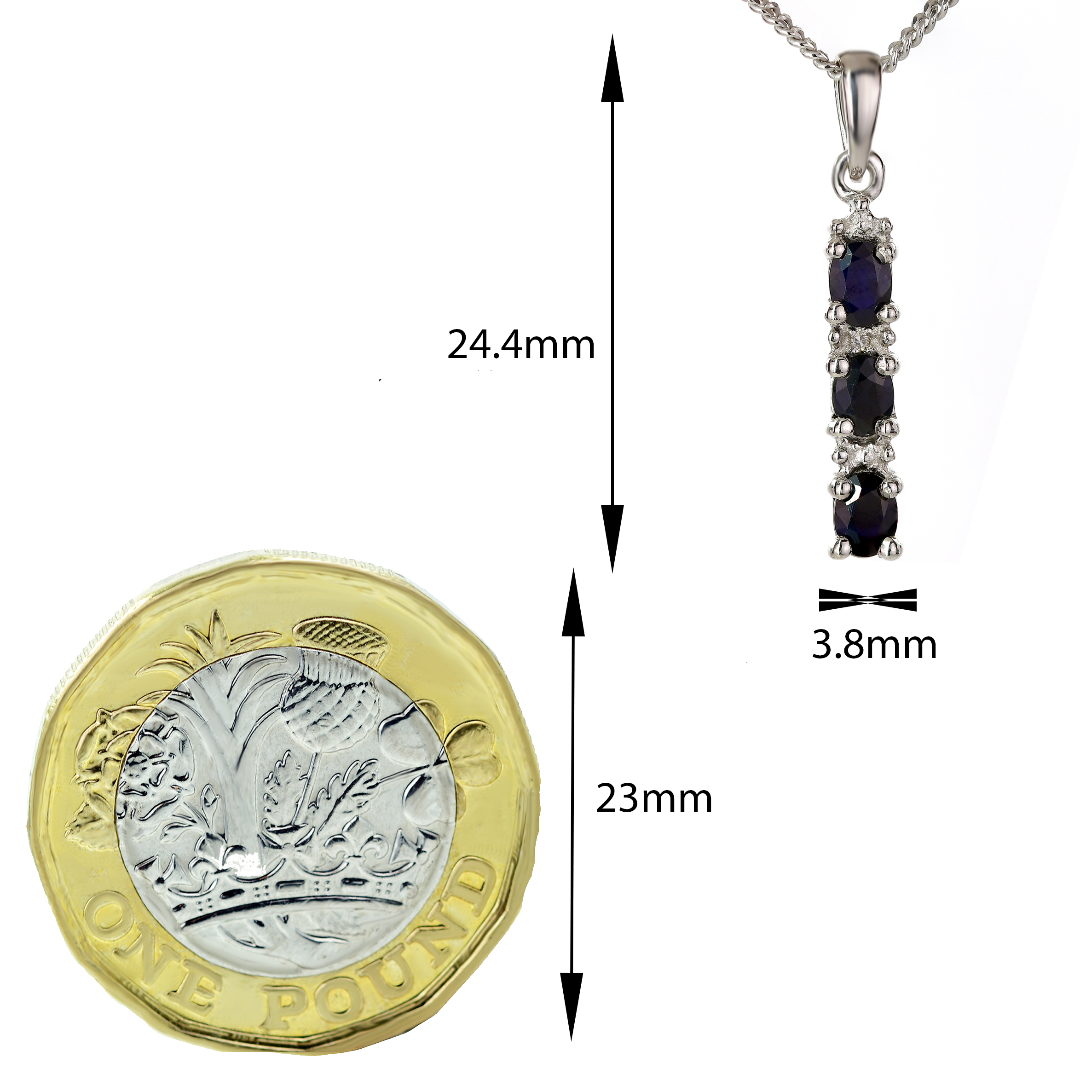 Elegant rhodium plated sterling silver 925 bar pendant set with a sparkling natural near colourless African diamond and natural Australian inky blue sapphires. Diamonds are associated with purity and perfection a symbol of light and brilliance. Sapphires are associated with purity and wisdom. They are the birthstone for September. This elegant pendant is suitable to wear for daytime or evening wear. It is supplied on an 18inch sterling silver chain. Both the pendant and chain are finished with a commercial grade rhodium plate to give a high quality shine finish. Supplied in an Ojewellery presentation box within a ribbon handled gift bag complete with product information authenticity card with space for a gift message and a jewellery cleaning cloth to keep your jewellery in ready to wear condition. It measures 24.4mm high by 3.8mm wide and the overall weight of the pendant is 1.2g