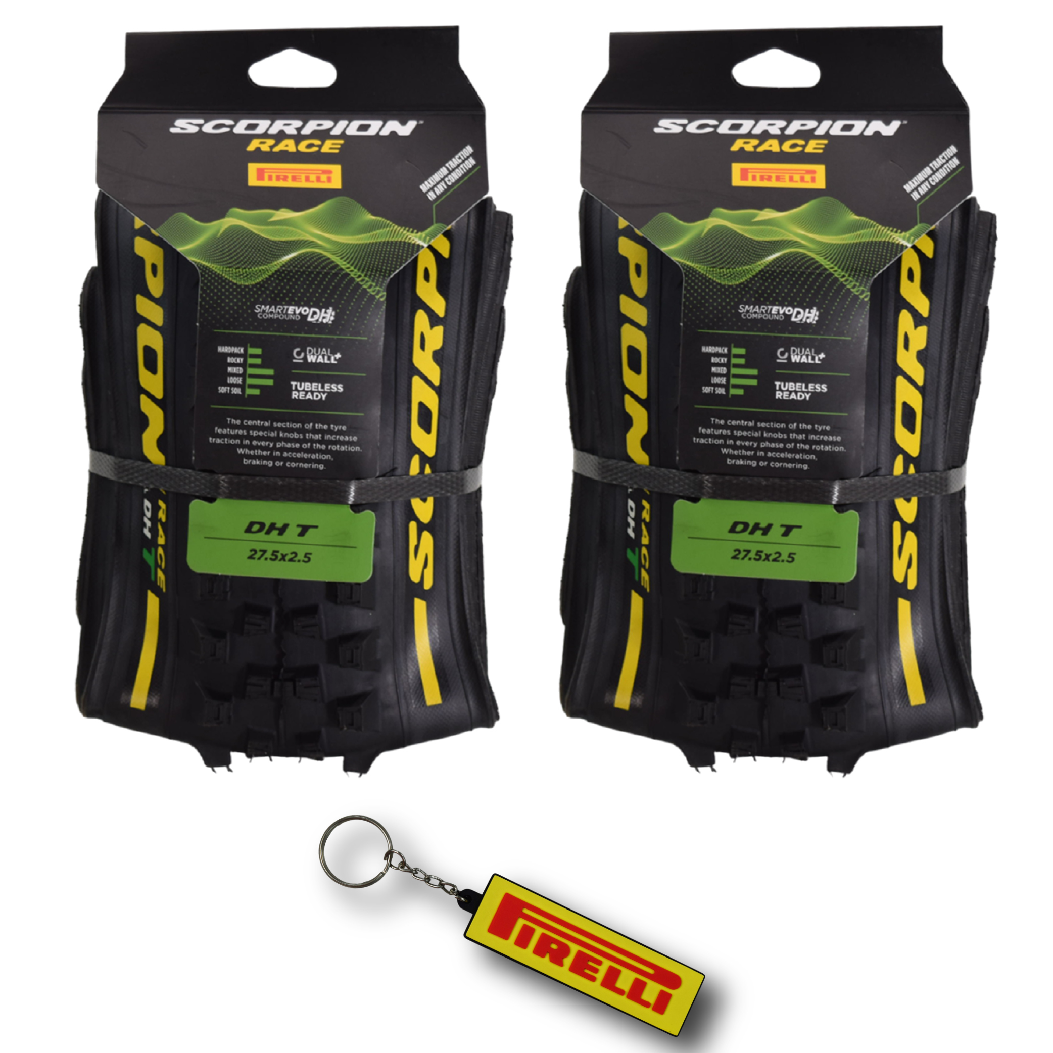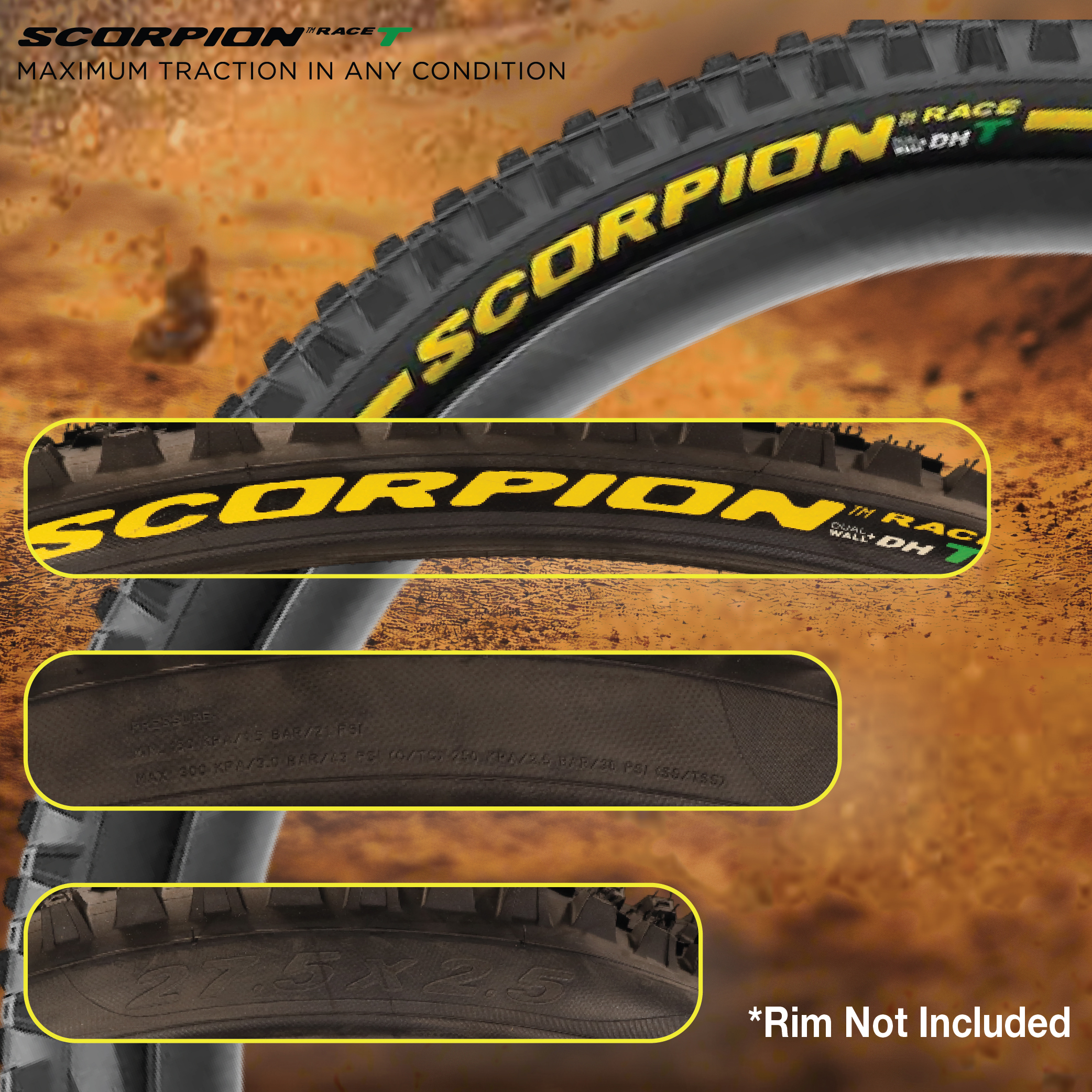 The Pirelli Scorpion Race DH Bicycle Tire is crafted for elite downhill racers and aggressive riders conquering the most demanding Downhill courses. Engineered for maximum grip and durability, this tire features an aggressive, high-profile tread pattern optimized for soft, loose, and muddy terrains, delivering unmatched traction on challenging descents. The SmartGRIP Gravity Compound, rooted in Pirelli’s motorsport heritage, provides superior grip and control in both wet and dry conditions, ensuring precise cornering and confident braking under extreme conditions. The 60 TPI DualWALL casing, with its robust multi-layer construction, offers exceptional puncture protection and sidewall stability, making it ideal for the rigors of downhill racing. Tubeless-ready for enhanced traction and lower rolling resistance, the Scorpion Race DH ensures durability and performance on the toughest trails. Perfect for competitive DH riders and those pushing the limits, this tire is built to dominate technical downhill tracks with precision and reliability. With its unique tread pattern and construction, the Scorpion Race DH T is optimized for intermediate terrains, making it the ideal choice for riders seeking high-performance tires that excel in varied conditions. Experience the ultimate in traction and control with the Scorpion Race DH T. Elevate your downhill riding experience and conquer every trail with confidence, knowing that your tire