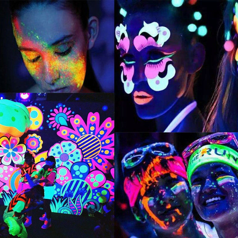 5. sichtbares fluoreszierendes Material: Gesichts- und Körperbemalung, Leuchtstäbe, Luftballons, Seifenblasen, Kerzen, Klebeband, Tinte, T-Shirts, Handschuhe, Poster, Wandaufkleber, Bar- und Tischgeschirr, usw.