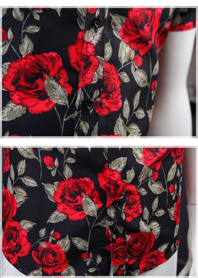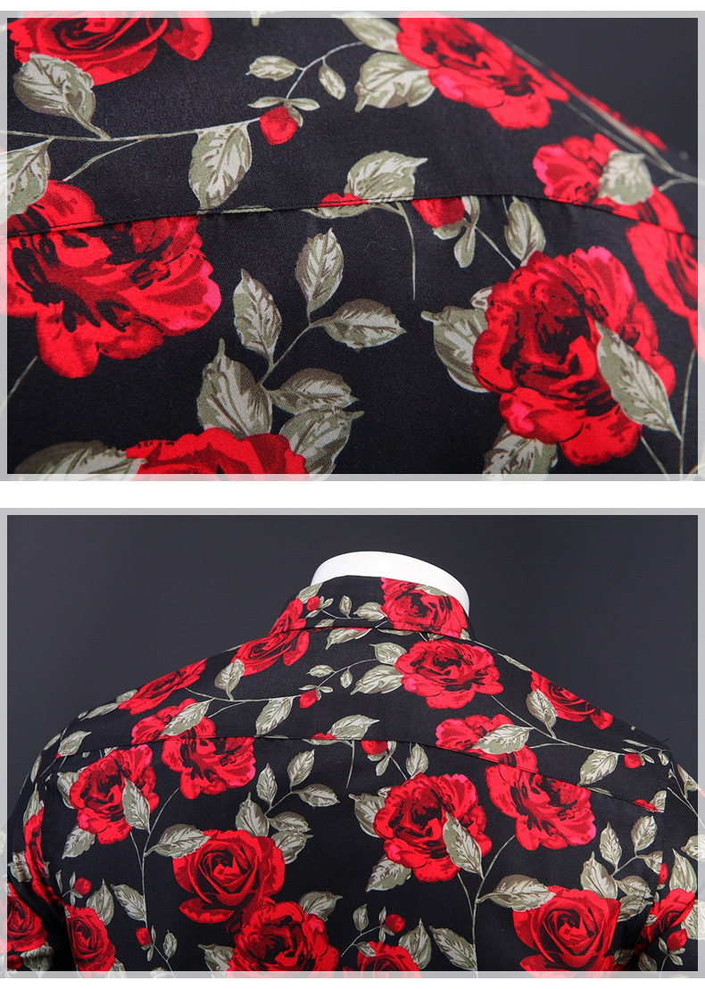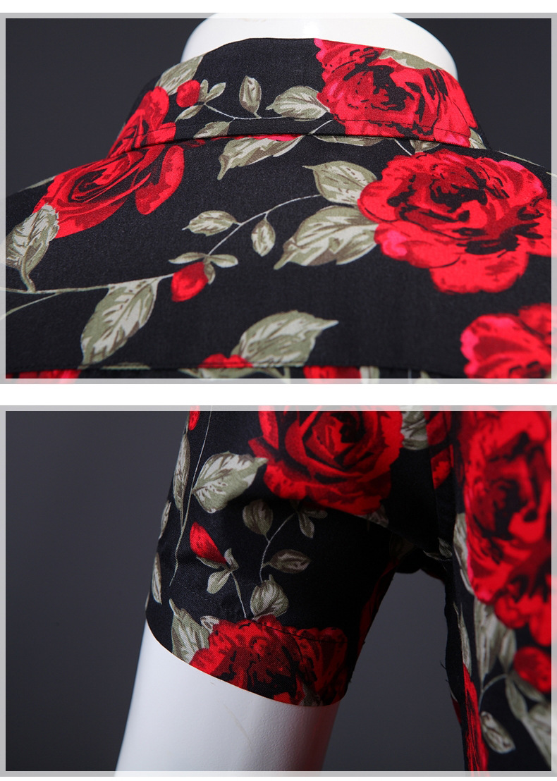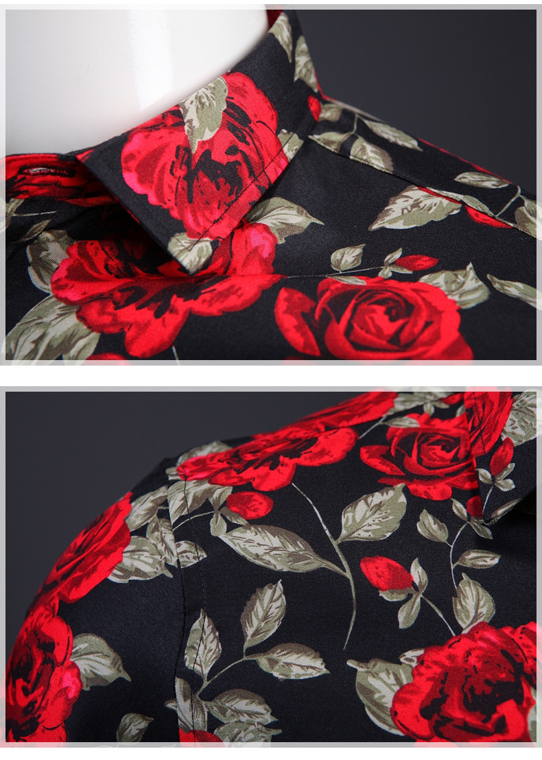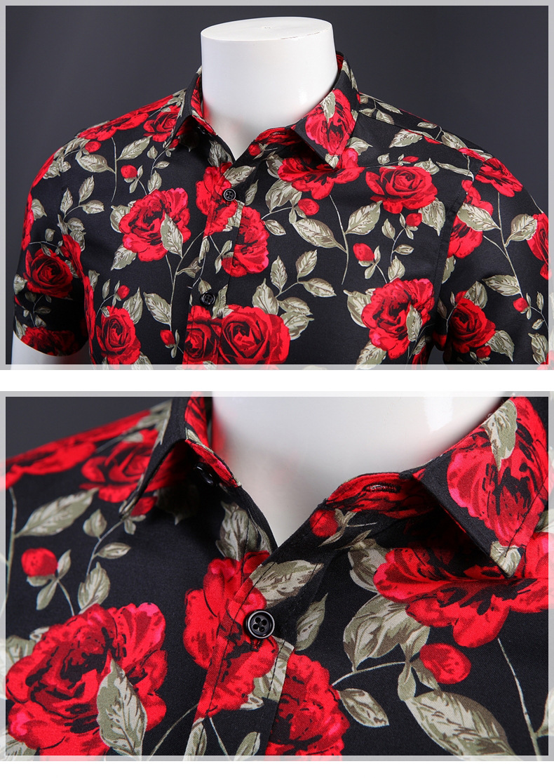Summer Men's Short Sleeve Rose Print Lapel Shirt Casual Slim-Fit Cardigan Top