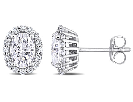 Timeless and elegant, these Moissanite Oval Halo Stud Earrings showcase class and style. Crafted in sparkling white gold, these earrings feature two oval cut, prong set white created moissanite gemstone (7 x 5 mm) in the centers surrounded by 16 additional shimmery moissanite gemstones forming halos. Enhanced with a high polish finish, these gemstone stud earrings secure comfortably with butterfly closures. These moissanite earrings are perfect for a woman who seeks elegance and sparkle.