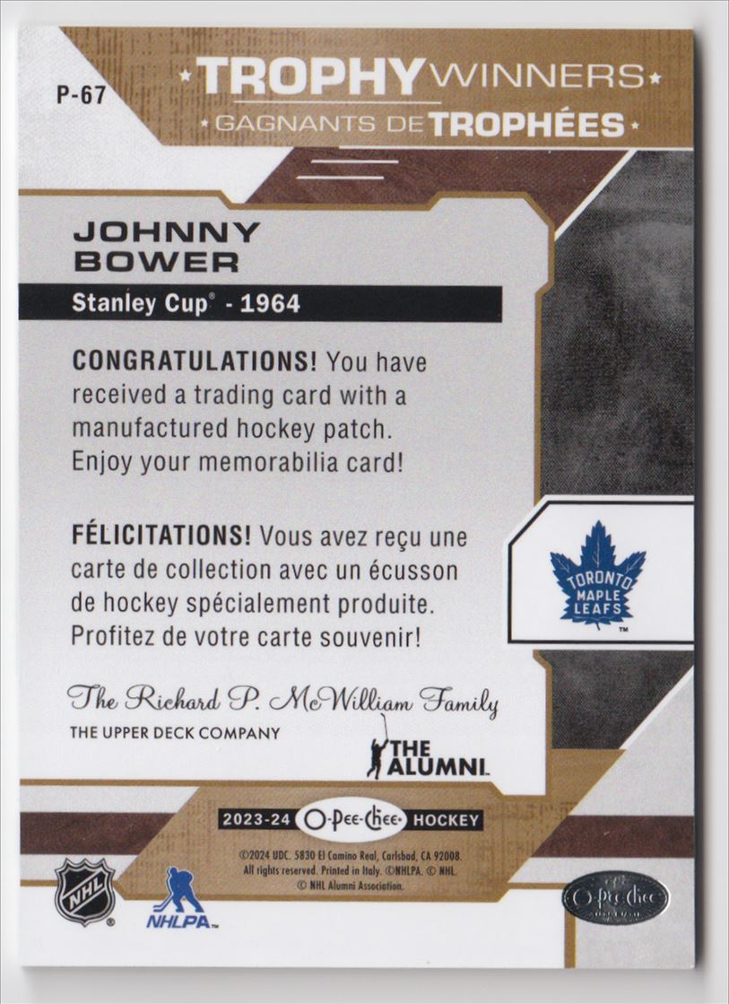 | 2023-24 O-Pee-Chee Manufactured Trophy Winners Patches Johnny Bower Toronto |