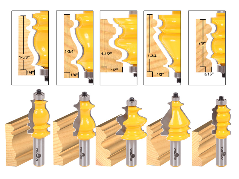 This Yonico 16501 molding Router bit set features 3 case molding router bits and 2 furniture base or furniture crown molding router bits. Each bit boasts bold and beautiful profiles that can be used on a large variety of furniture building projects. Buying these bits as a set saves you over $25 compared to buying these bits individually.