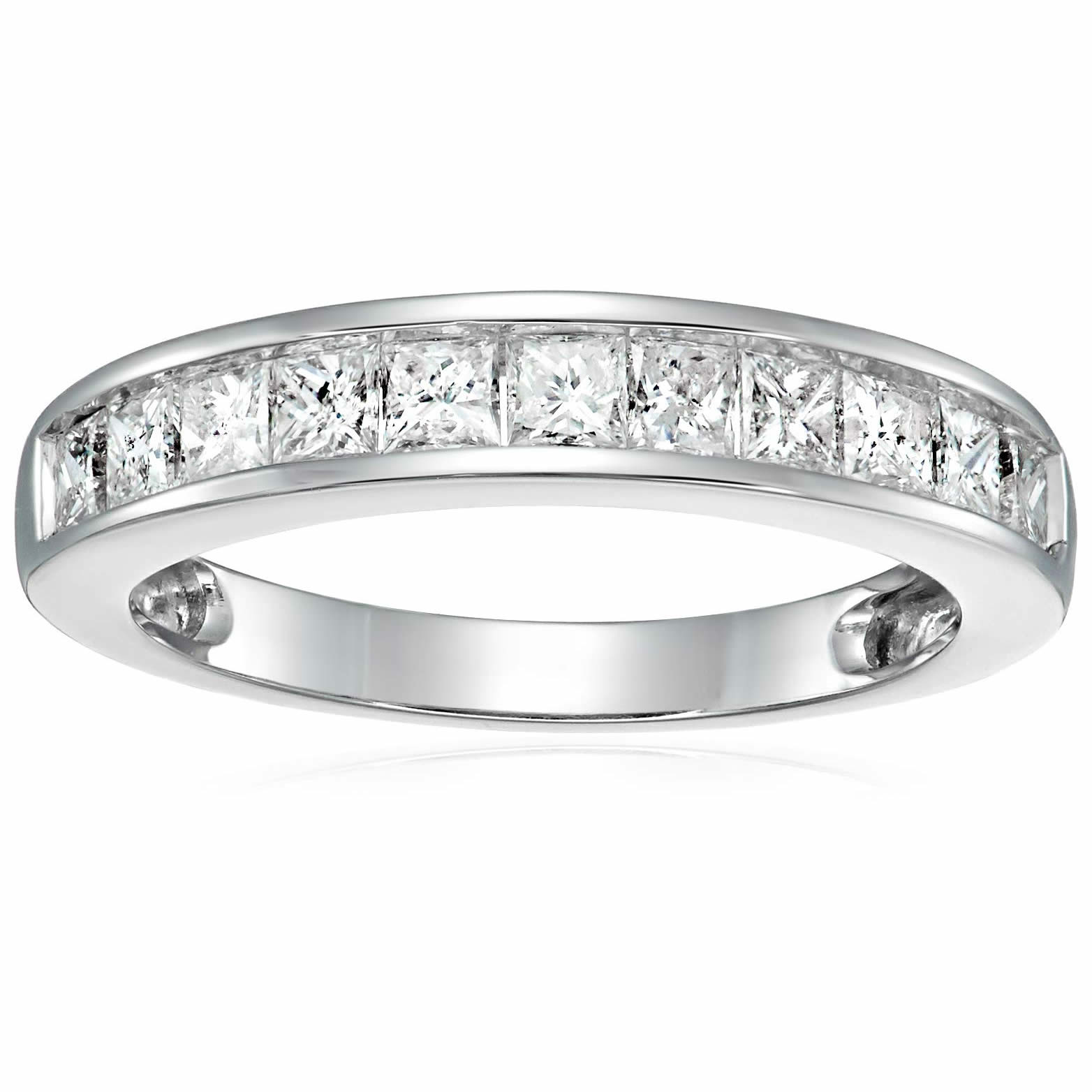 Product Description Exquisite, elegant 1 cttw princess diamond wedding band in 14k white gold. The 9 to 12 (depending on ring size) dazzling diamonds are natural diamonds set in a channel setting. The ring weighs 2 grams. This ring is available in multiple sizes. Gift box is included with this bridal ring.