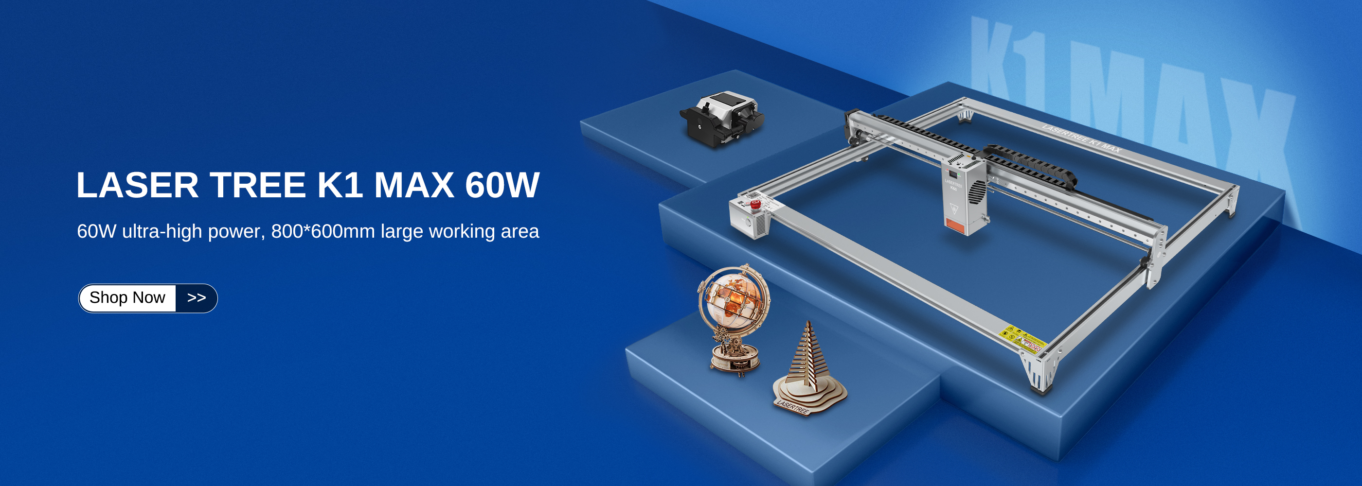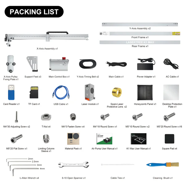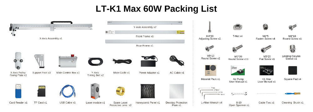 Laser Tree K1 MAX offers you a full set of accessories - Laser engraving machine + 60W Laser head + Air pump + Honeyomb Panel)