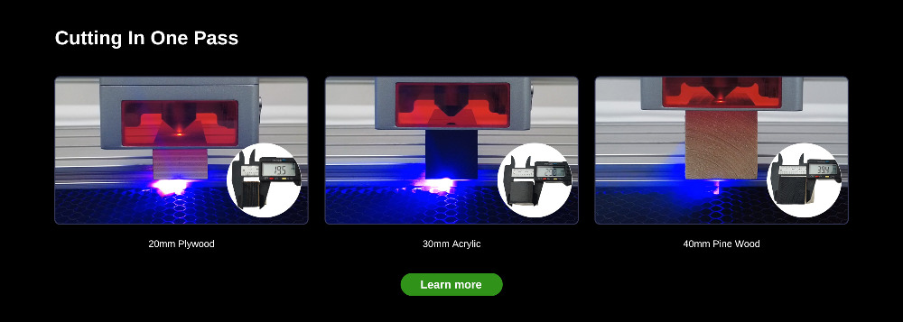 2. Cutting in one Pass(Power: 100%) 20mm Basswood Plywood : 1 pass cutting. 40mm Pine Board :1 pass cutting. 30mm Black Acrylic : 1 pass cutting.