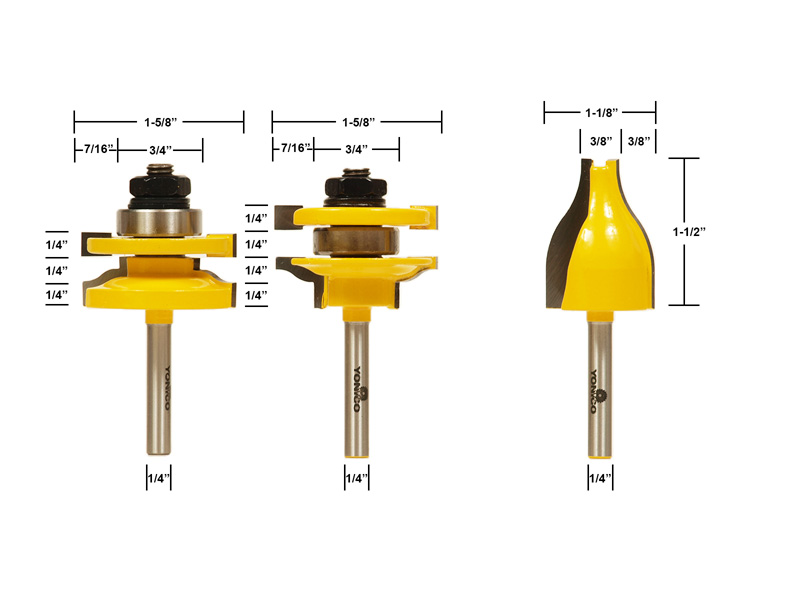 The Yonico 12334q Door Construction Router Bit Set includes matched 1/4" ogee rail and stile bits and a 1/4" vertical ogee panel raiser. Use with up to 1" stock. Bit shanks are 1/4". Router Bit Measurements: • Rail & Stile - 1-5/8" diameter, 1" cutter height, 3" overall height, 3/8" depth of cut, 7/8" bearing diameter • Vertical Panel Raiser - 1-1/8" diameter, 1-1/2" cutter height, 3" overall height, 3/8" depth of cut, 3/8" bearing diameter Rail and stile bits create a perfectly matched rail and stile door frame. The ogee vertical raised panel router bit puts a classic edge on the central panel of your door. Ball bearing guides allow you to make precise cuts without the use of a fence. The Yonico 12334q router bit set comes in a solid wood storage case.