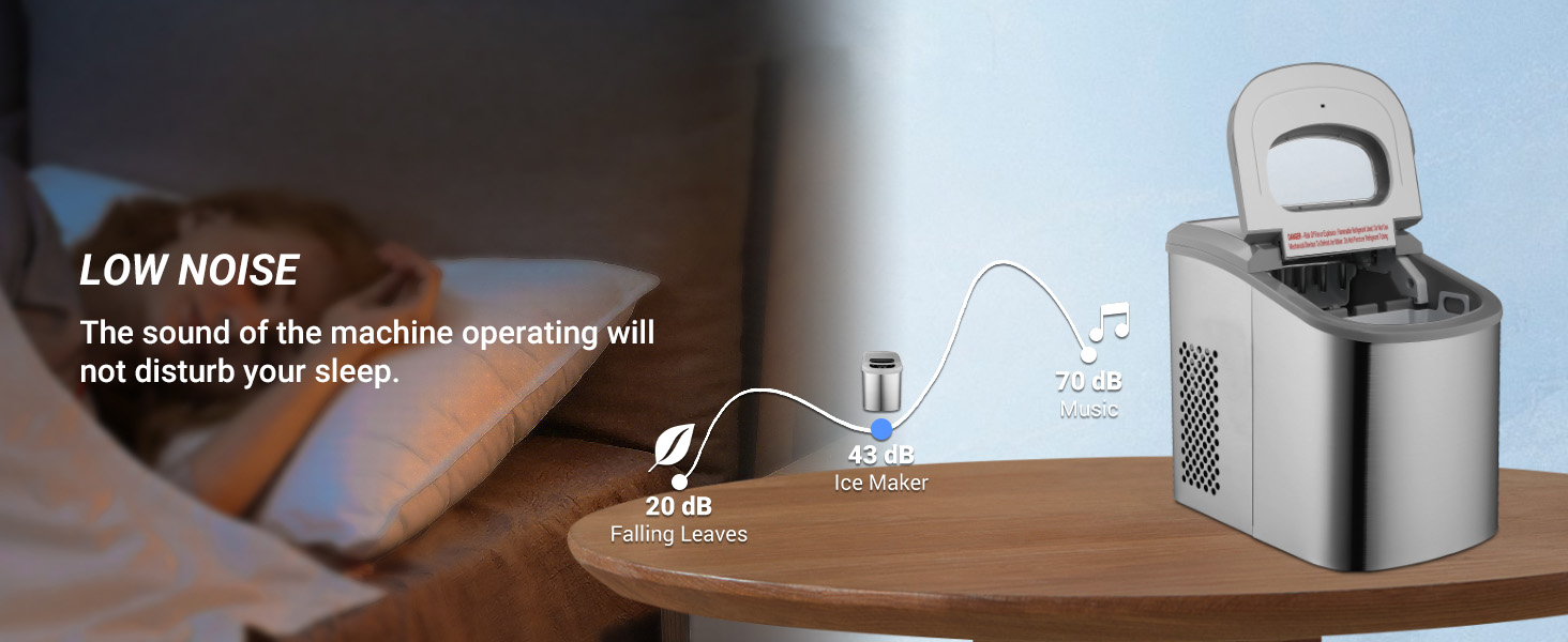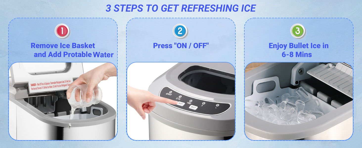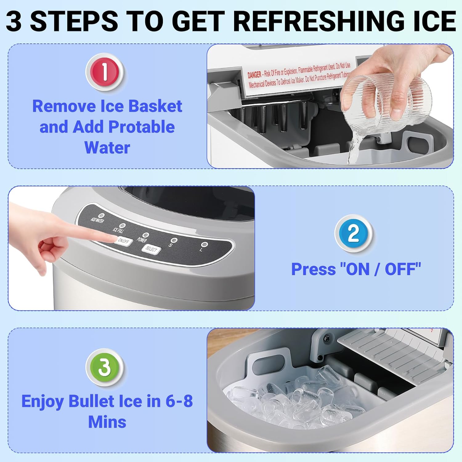 Quick & Quiet Operation: Experience the luxury of bullet ice cubes in just 6-8 minutes, all while enjoying a remarkably quiet countertop ice maker. Perfect for any occasion, this machine is designed to deliver ice swiftly and silently.