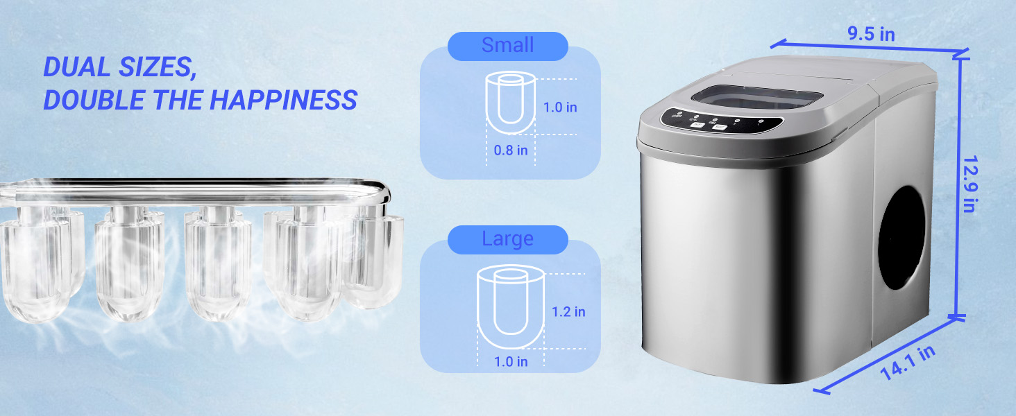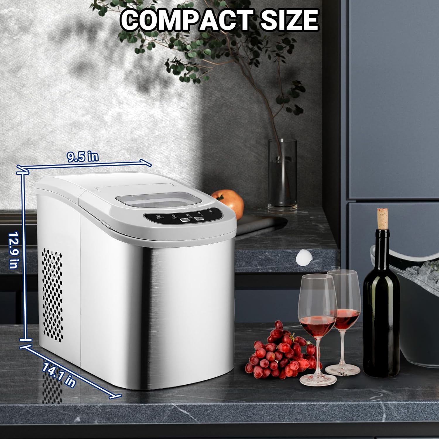 Large Capacity, Compact Size: Despite its mini size, this portable ice machine boasts an impressive daily production of 26 pounds of ice and can store up to 1.5 pounds. Compact in design (measuring 12.9"H x 9.5"W x 14.1"D), it fits seamlessly on your counter, making it ideal for parties, camping, RV adventures, bars, and more.