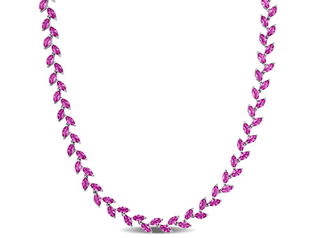 Adorn yourself with the delicate beauty of nature with this enchanting leaf necklace featuring a total gem weight of 29.5 carats (t.g.w.) of Created Pink Sapphires. Crafted in sterling silver, each sapphire leaf sparkles with a soft pink hue, evoking a sense of femininity and grace. The intricate design captures the essence of a blooming garden, making it a perfect accessory for nature lovers and romantics alike. Elevate your style with the whimsical charm and timeless elegance of this meticulously crafted necklace.