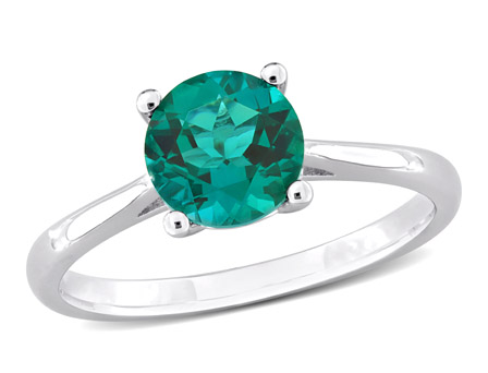 Celebrate the lush elegance of the Amour Women's 1 1/7 CT TGW Created Emerald Fashion Ring. Crafted in sterling silver, this exquisite piece features a captivating 1 1/7 carat created emerald, a gemstone that embodies the verdant beauty of May's birthstone. The ring showcases a solitaire design, radiating timeless charm and making it a perfect promise ring, fashion statement, or a delicate addition to your collection. Its stackable feature allows for versatile layering, while its dainty and delicate presence makes it an ideal gift for her.