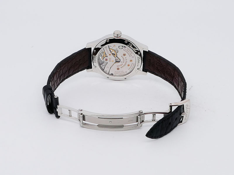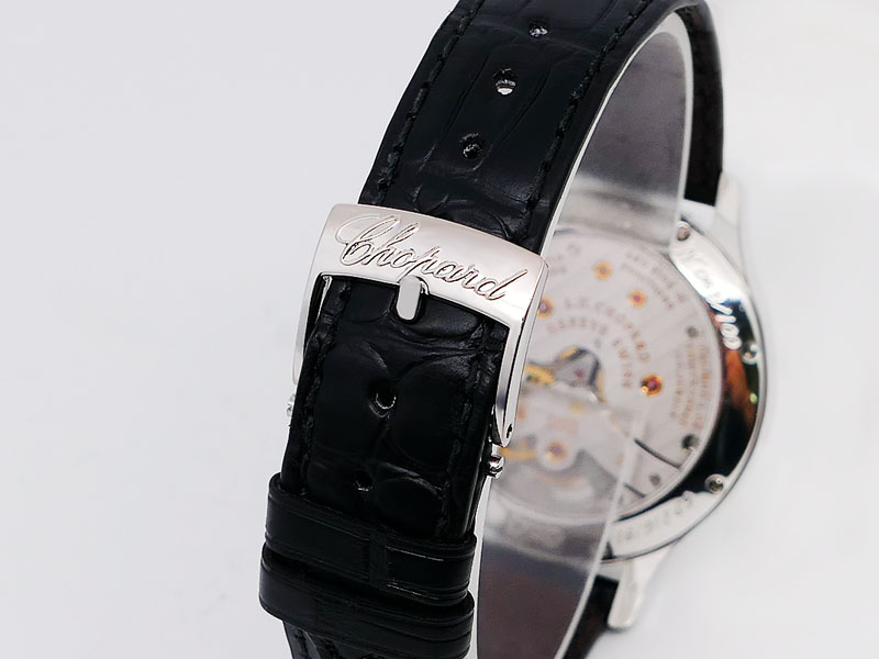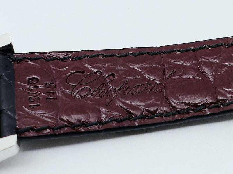 Sapphire crystal, transparent caseback. Chopard Black alligator with