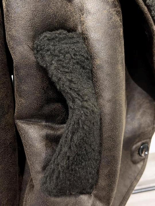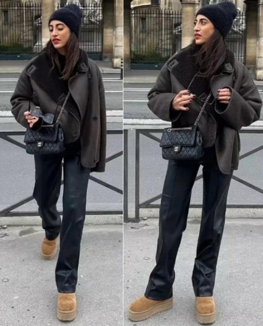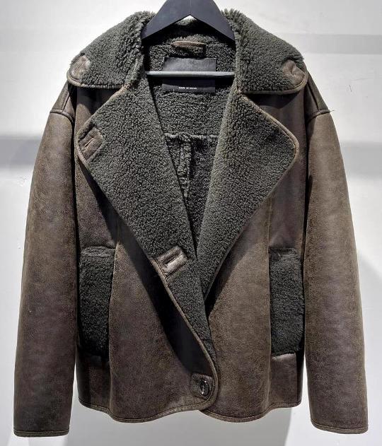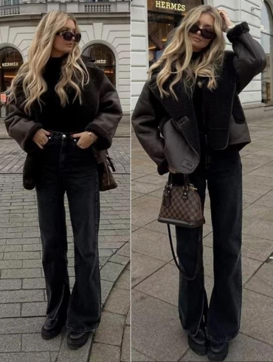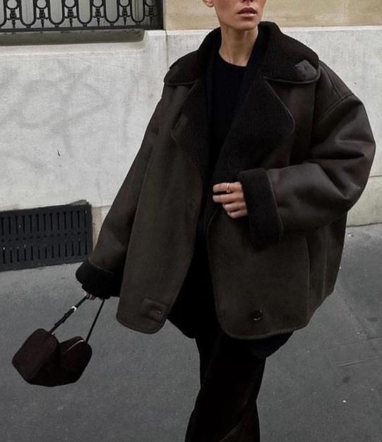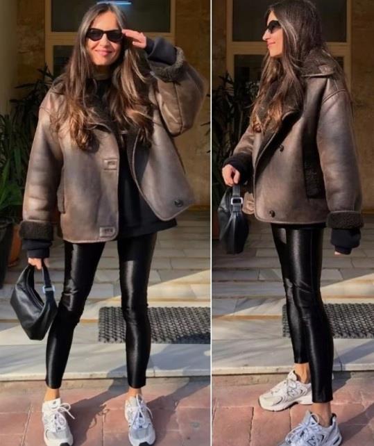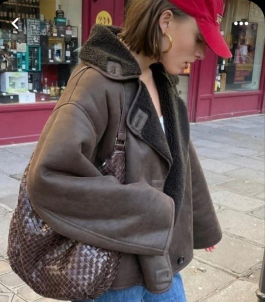 This must have double faced aviator jacket from Zara's latest collection is made of a leather effect recycled polyester fabric with matching faux shearling lining. This jacket is cropped in length and features a wide lapel collar and long sleeves with front patch pockets and a button up front. This is the ultimate stylish and practical winter coat to keep you warm during the cold weather.