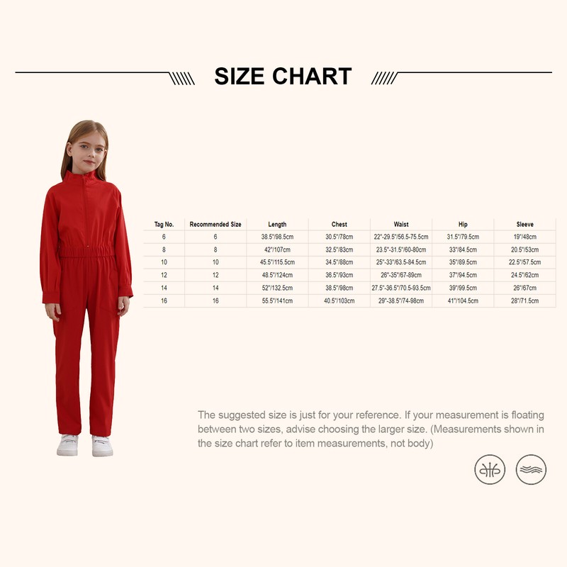 Girl’s stand collar long sleeve coverall with zipper closure in the front, easy to put on or take off.
