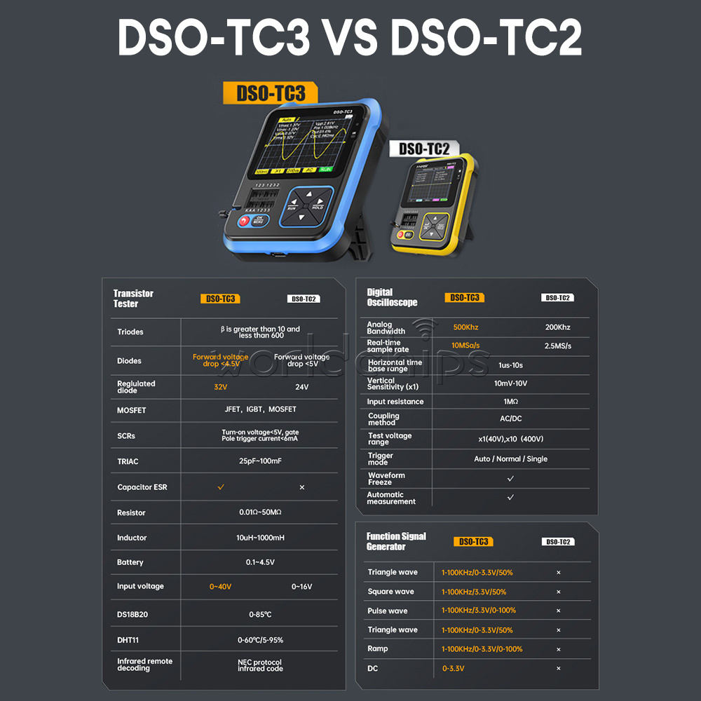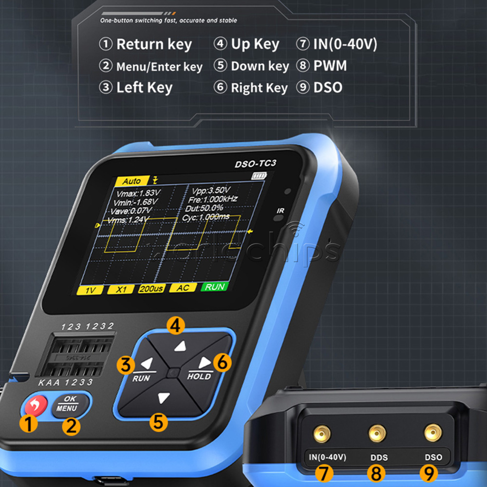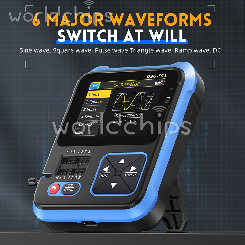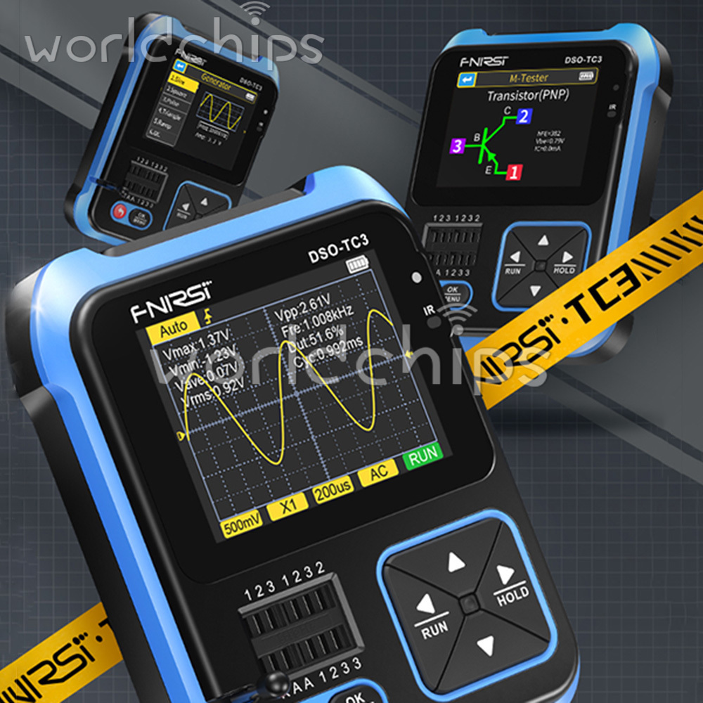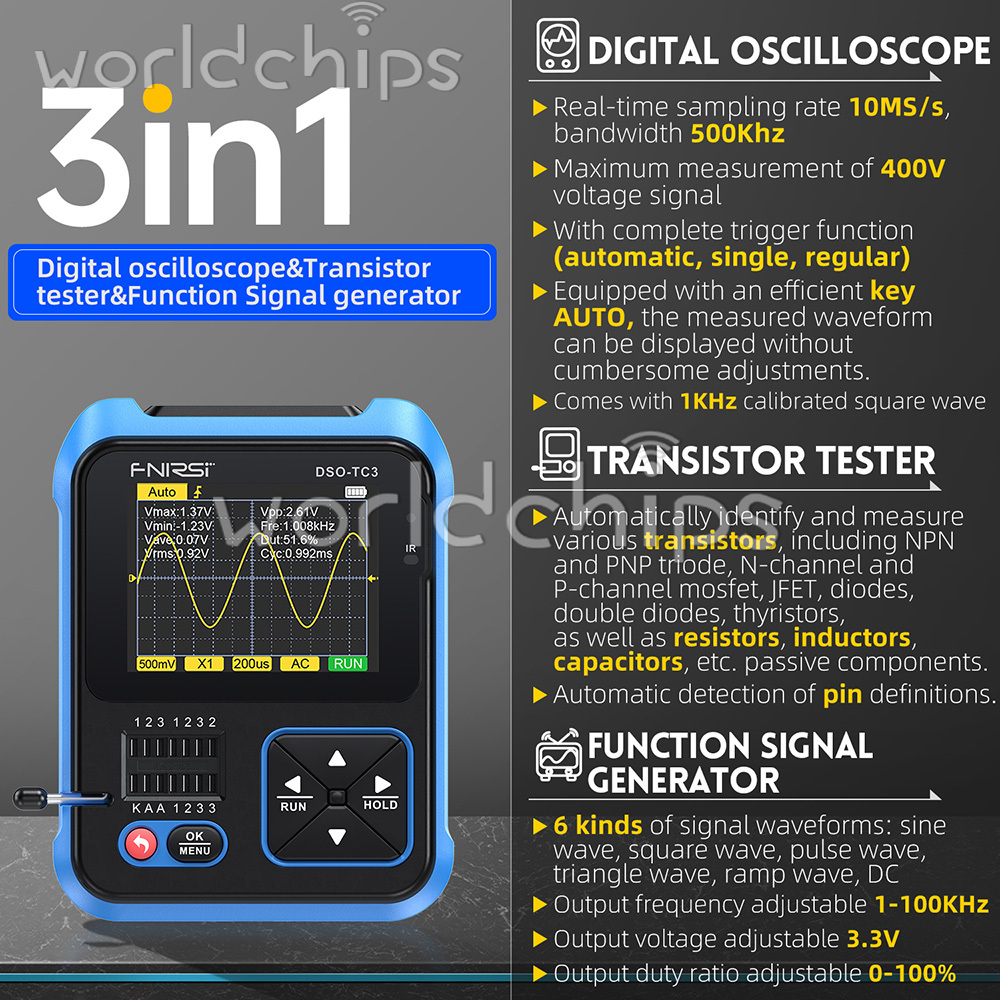 3 In 1 Function: This product ingeniously integrates digital oscilloscope, transistor tester and signal generator functions into one machine.