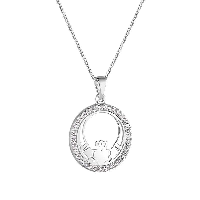 This beautiful sterling silver Solvar Claddagh necklace is designed in a disc shape with a surround of Cubic Zirconia. With its flat lay design, this petite piece is a wonderfully contemporary take on the traditional Irish Claddagh. A fantastic gift for anyone who loves the gorgeous, timeless symbolism of the Claddagh but prefers their jewelry a bit more modern.
