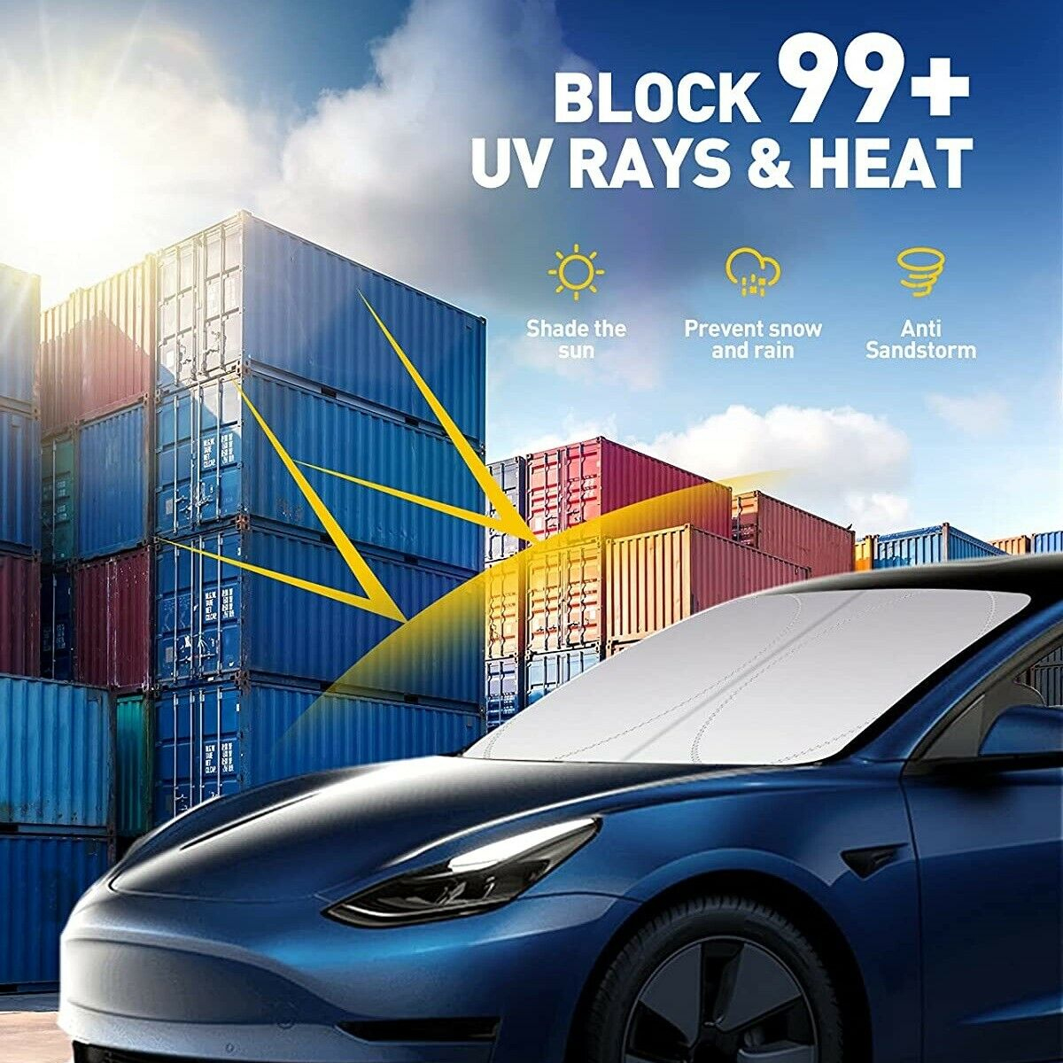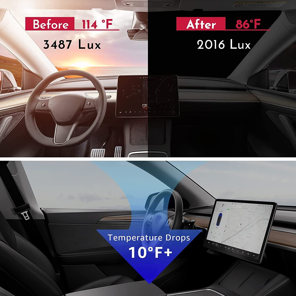 - Keeps Cool: Made of premium 210T reflective polyester to reduce heat buildup up to 40°F, it will block 99% of damaging UV rays. Keep your Model 3 Model Y cooler.
