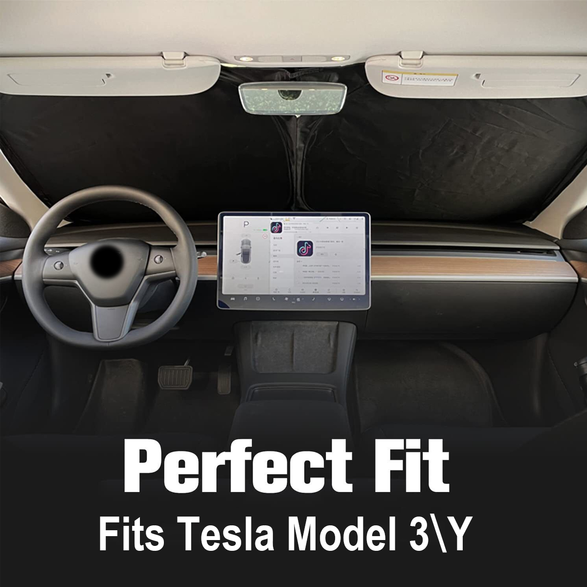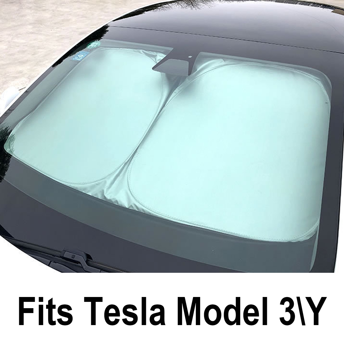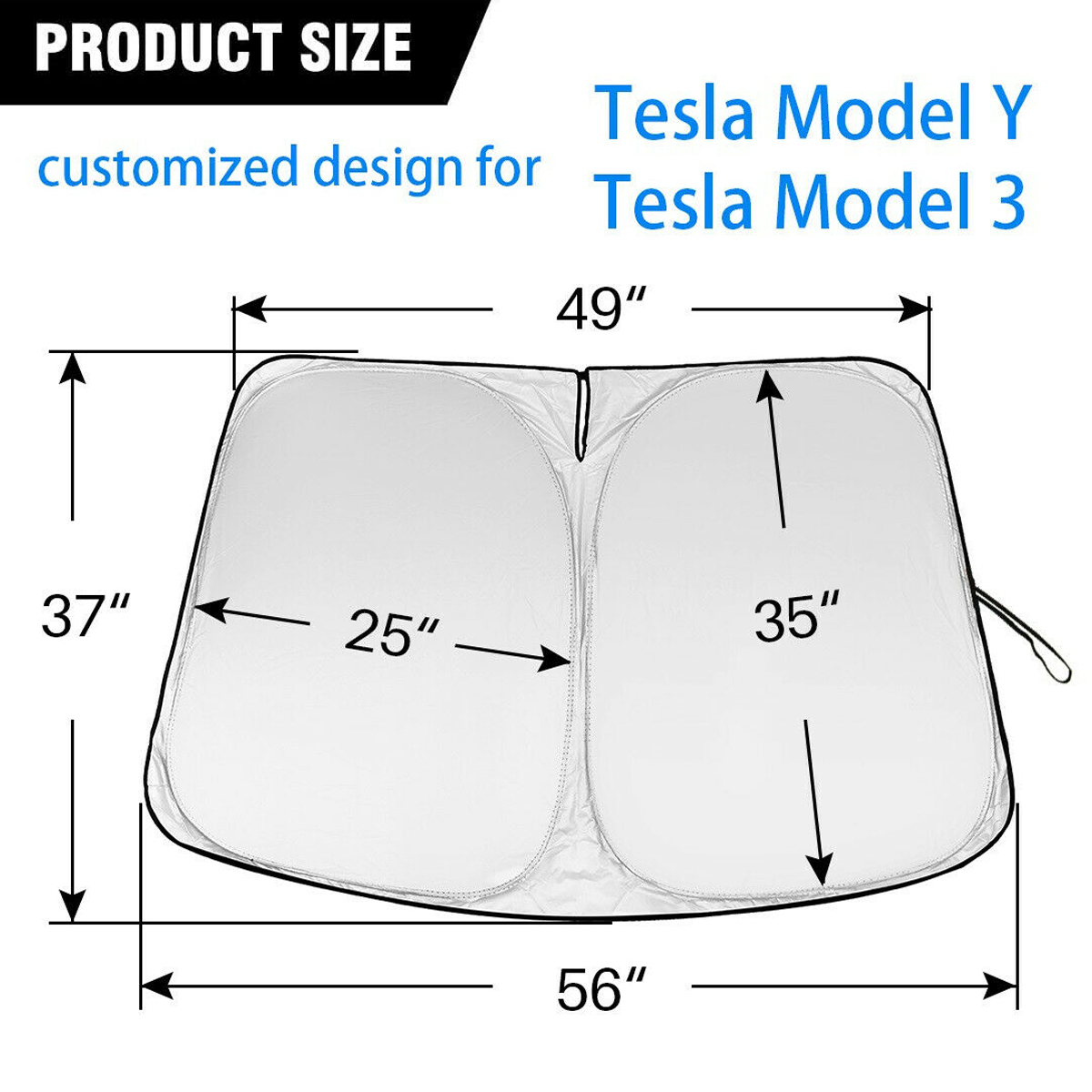 - Custom Design: The windshield shade has been custom cut specifically for the Tesla Model 3 Model Y. Precise fit design and Reinforced steel rings make enough to make the shade fit precisely to the window, no need for suction cups to hold it in place. It won't sag or collapse. Fits all Tesla Model 3 Tesla Model Y.