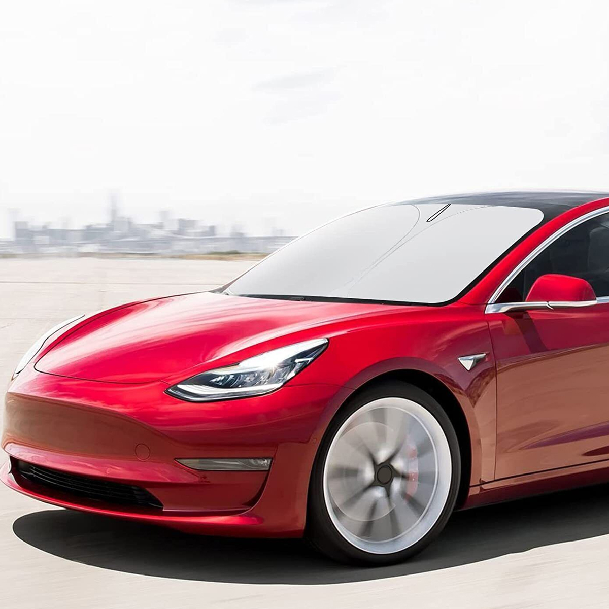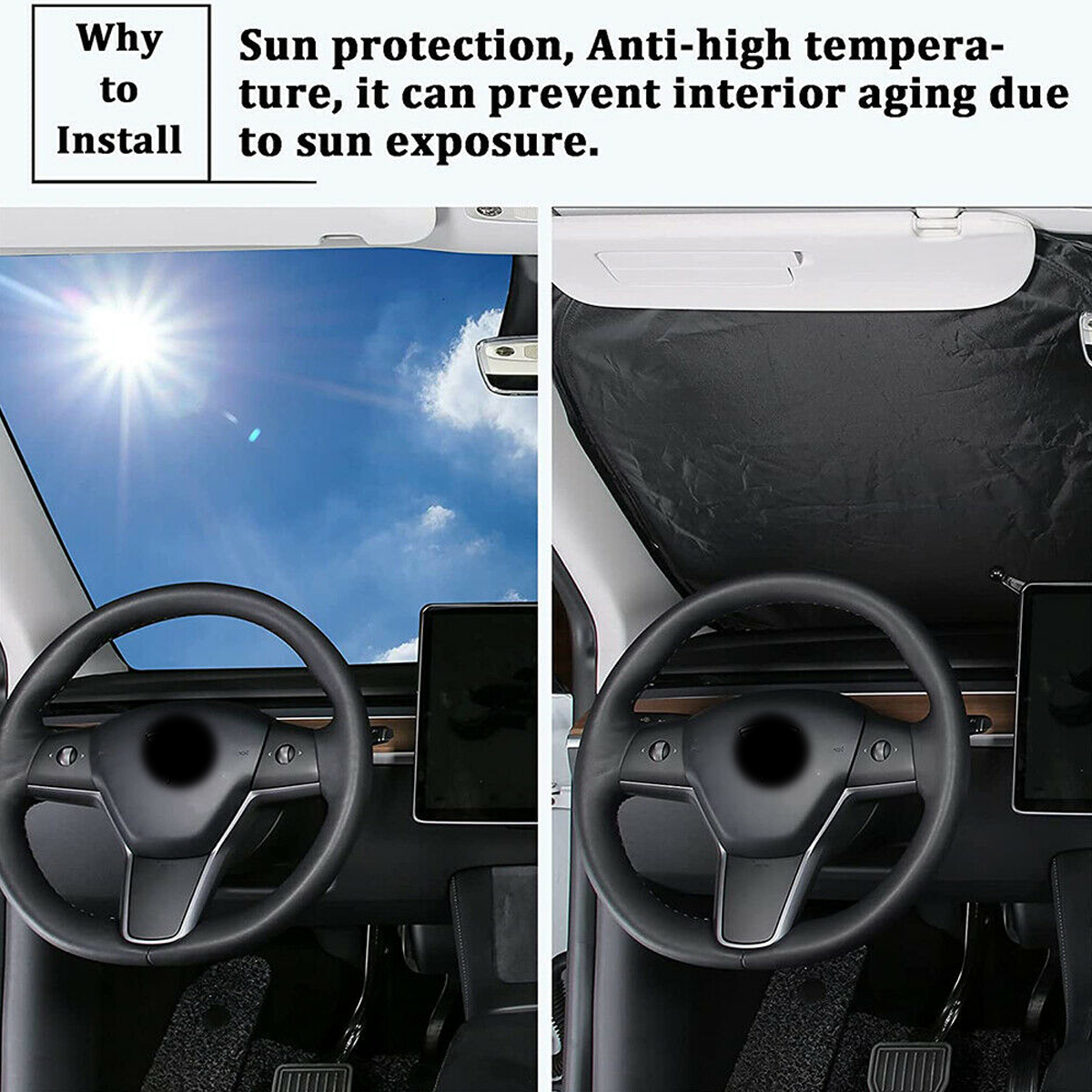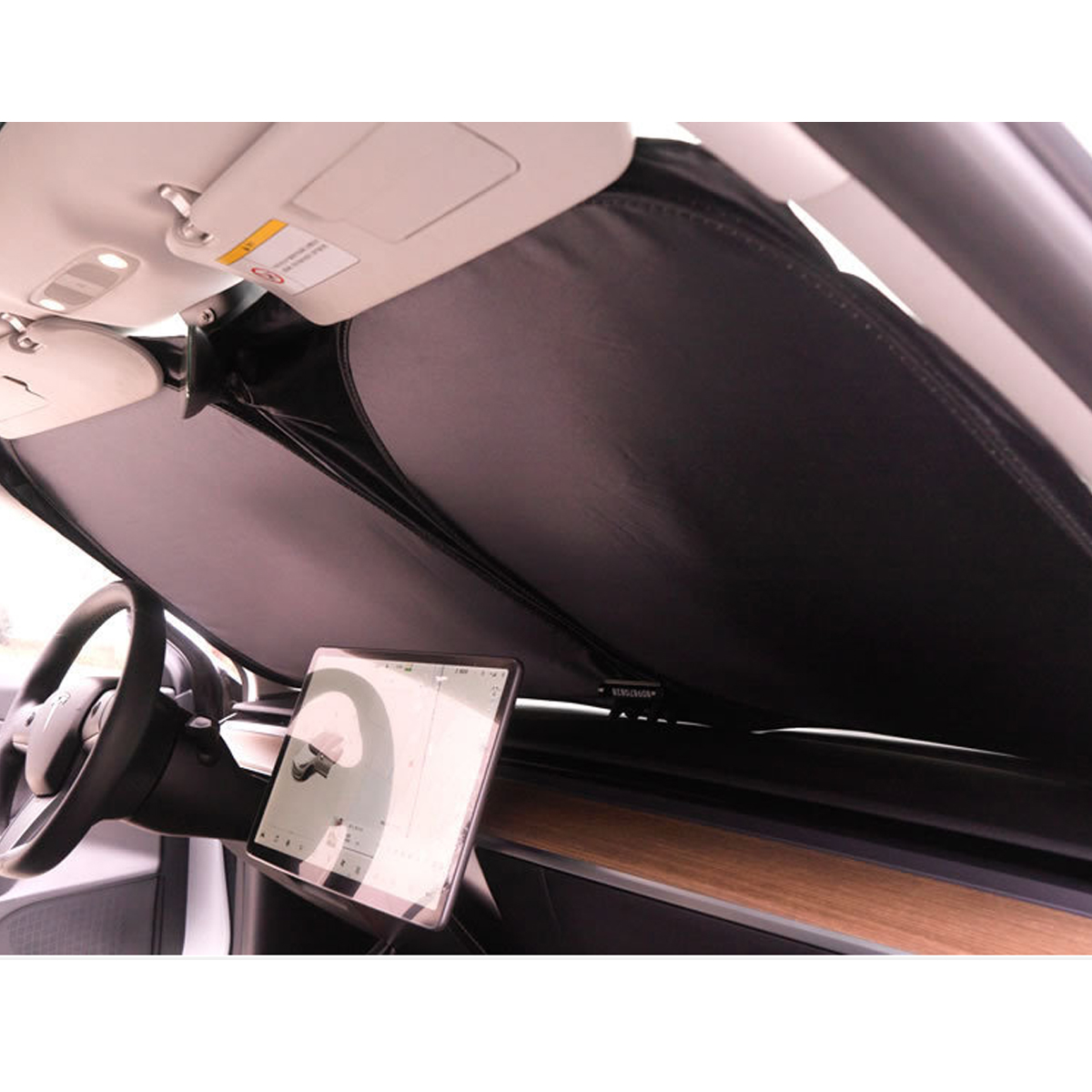 - Custom Design: The windshield shade has been custom cut specifically for the Tesla Model 3 Model Y. Precise fit design and Reinforced steel rings make enough to make the shade fit precisely to the window, no need for suction cups to hold it in place. It won't sag or collapse. Fits all Tesla Model 3 Tesla Model Y.