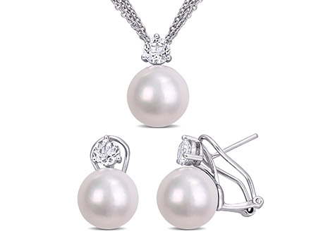 Make her birthday special with this elegant 2-pc Drop Earrings and Pendant with Chain Set. Crafted in lustrous sterling silver, this exquisite set features three 11-12mm cultured freshwater pearls and three prong set, white topaz gemstones (5x5mm) placed on the top. The lovely pendant is suspended on a 17-inch three strand round cable chain secured with a lobster clasp and the earrings have clip back closures. Polished to brilliance, this splendid set will give her a classic look, makes for a perfect gift.