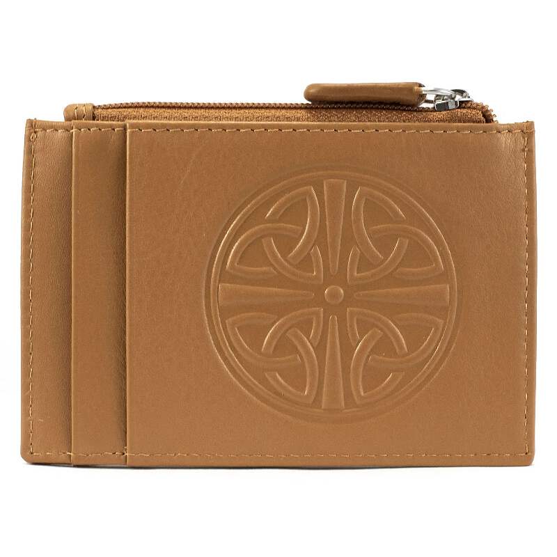 This BILI Celtic Camel Brown ID Holder is made of genuine leather and features an embossed Celtic Knot design on the front. The top zipper opens to full capacity- great for holding cash!- while the exterior features a total of four pockets, one of which is windowed, to hold credit cards, I.D., or a driver's license.