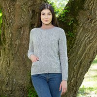 Luxuriate in the softness of this Saol Knitwear Grey Ladies Button Cardigan any time of year! This Merino wool blend cardigan is the perfect, ultra cosy weight for wherever life takes you, no matter the season! Ornate Aran stitching throughout brings a subtle, uniquely Irish beauty to the piece, while the front pockets add an air of practicality to this gorgeous cardigan!