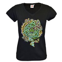This black ladies V-neck cotton T-shirt is a fitted style and has an intrinsic multi colored shamrock Celtic knot as the main feature with a small Ireland logo.