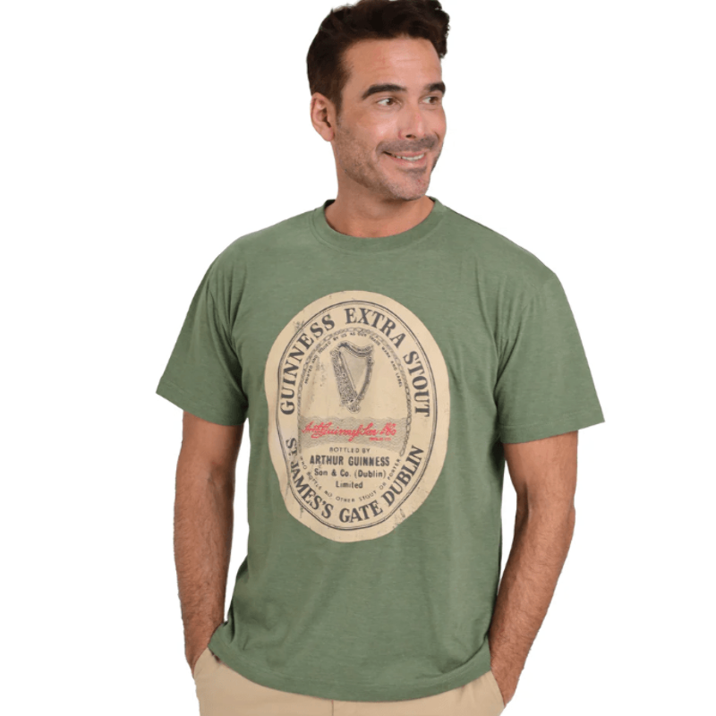 This lovely green Guinness tee is the perfect way to represent your favorite beer. With extra soft material made from a high-quality polycotton fiber, this tee was designed with style and comfort in mind. The crew cut neck and a boxy fit makes it perfect for both men and women. Features a center-front distressed 'Guinness® Gaelic label' graphic screen printed in cream and green.