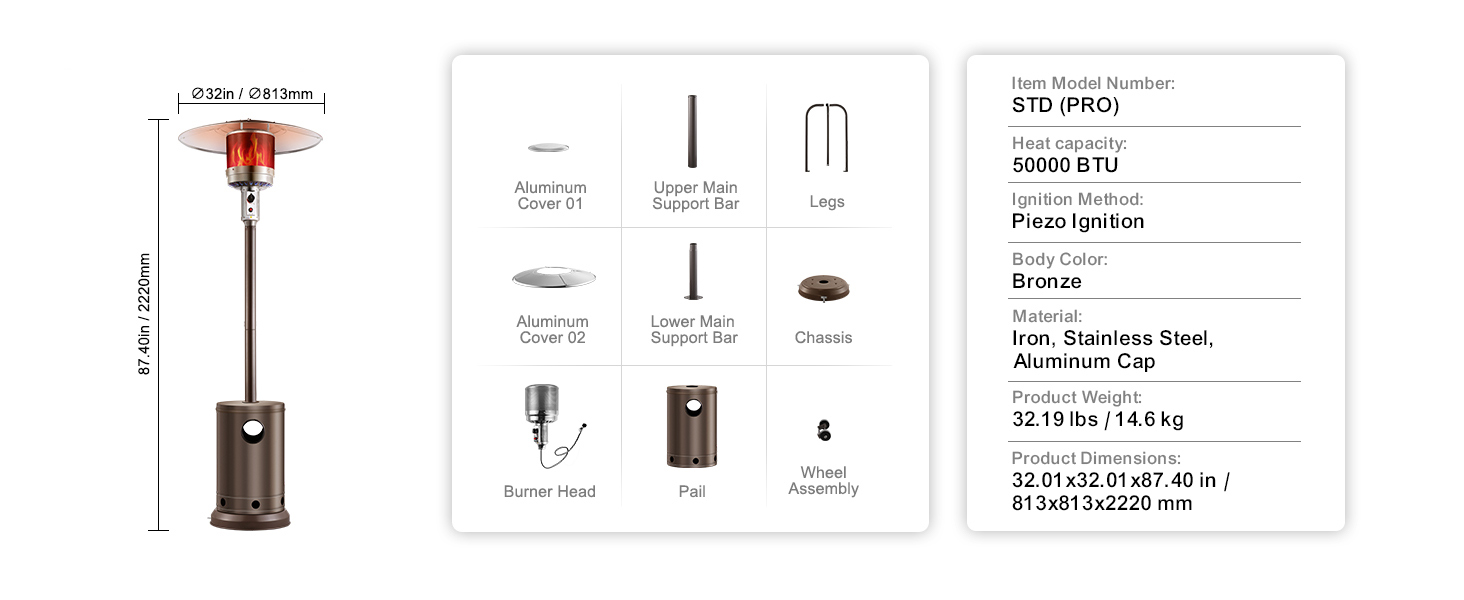 Fixed Propane Heater features durable stainless steel, tilt auto-shutoff for safety, and wheels for easy mobility. Enjoy cozy warmth in your patio, courtyard, or outdoor camping with ease and style!