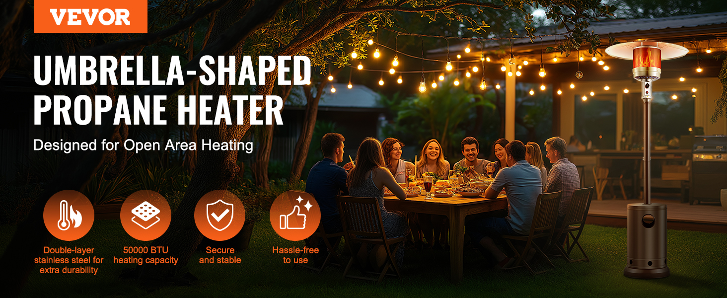 VEVOR Fixed Propane Heater features durable stainless steel, tilt auto-shutoff for safety, and wheels for easy mobility. Enjoy cozy warmth in your patio, courtyard, or outdoor camping with ease and style!