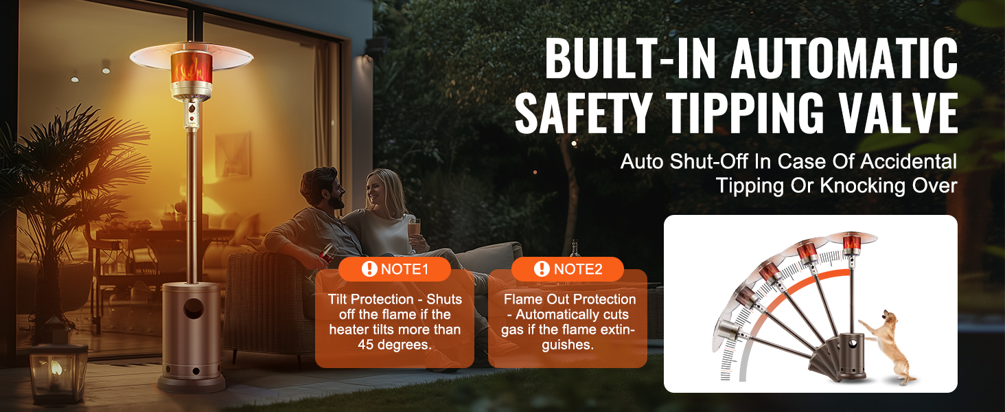 The propane heater includes an automatic tilt valve that shuts off the flame if tipped over 45 degrees, and a flameout system that cuts gas supply if the flame goes out. Regular regulator checks ensure stable performance.