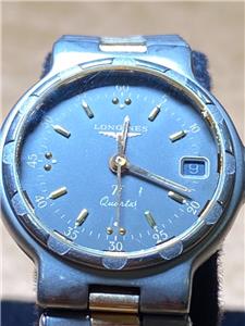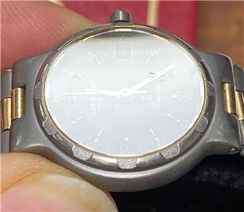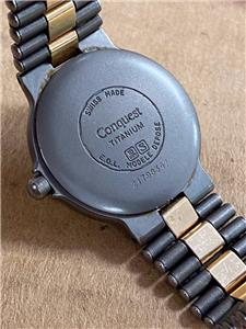 LONGINES CONQUEST TITANIUM GOLD PLATED 24mm LADIES QUARTZ WATCH. ITEM IS USED WITH COSMETIC WEAR BUT STILL WORKING GOOD, PLEASE SEE PHOTO'S. WATCH DOESNT COME WITH BOX OR PAPERS, WATCH ONLY.