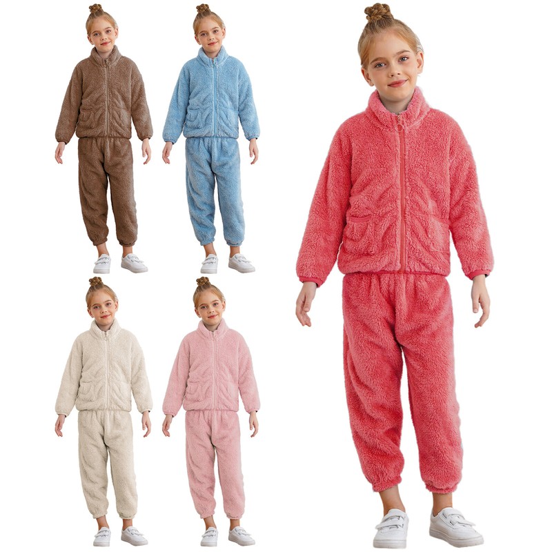 Unisex children’s thick flannel pajama set include stand collar long sleeve zipper top and mid waist elastic waistband pants.
