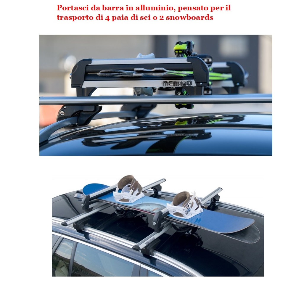 -Portasci da barra in alluminio, pensato per il trasporto di 4 paia di sci o 2 snowboards