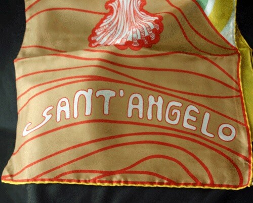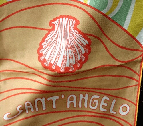 Silk twill scarf. Shell on sand in red and tan with crazy wave pattern in green and white on an yellow ground and border. Nice hand rolled hem.