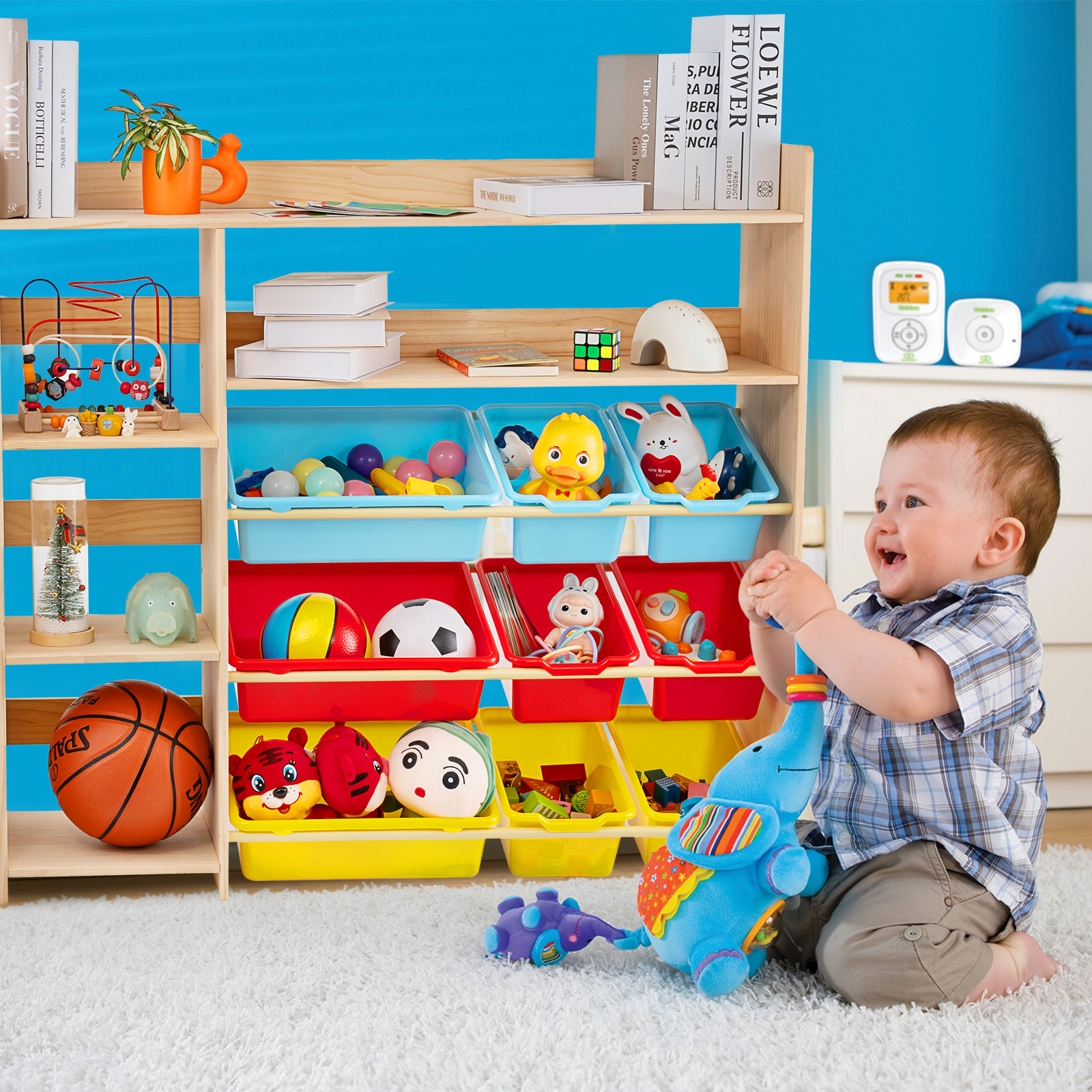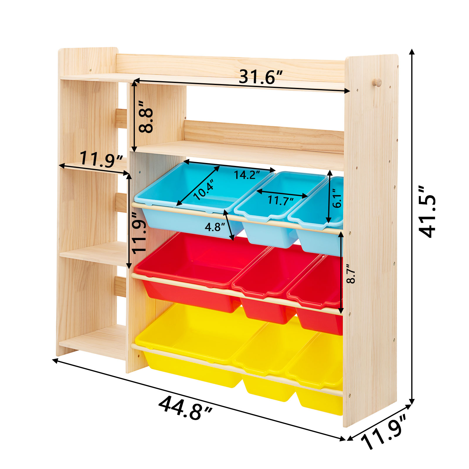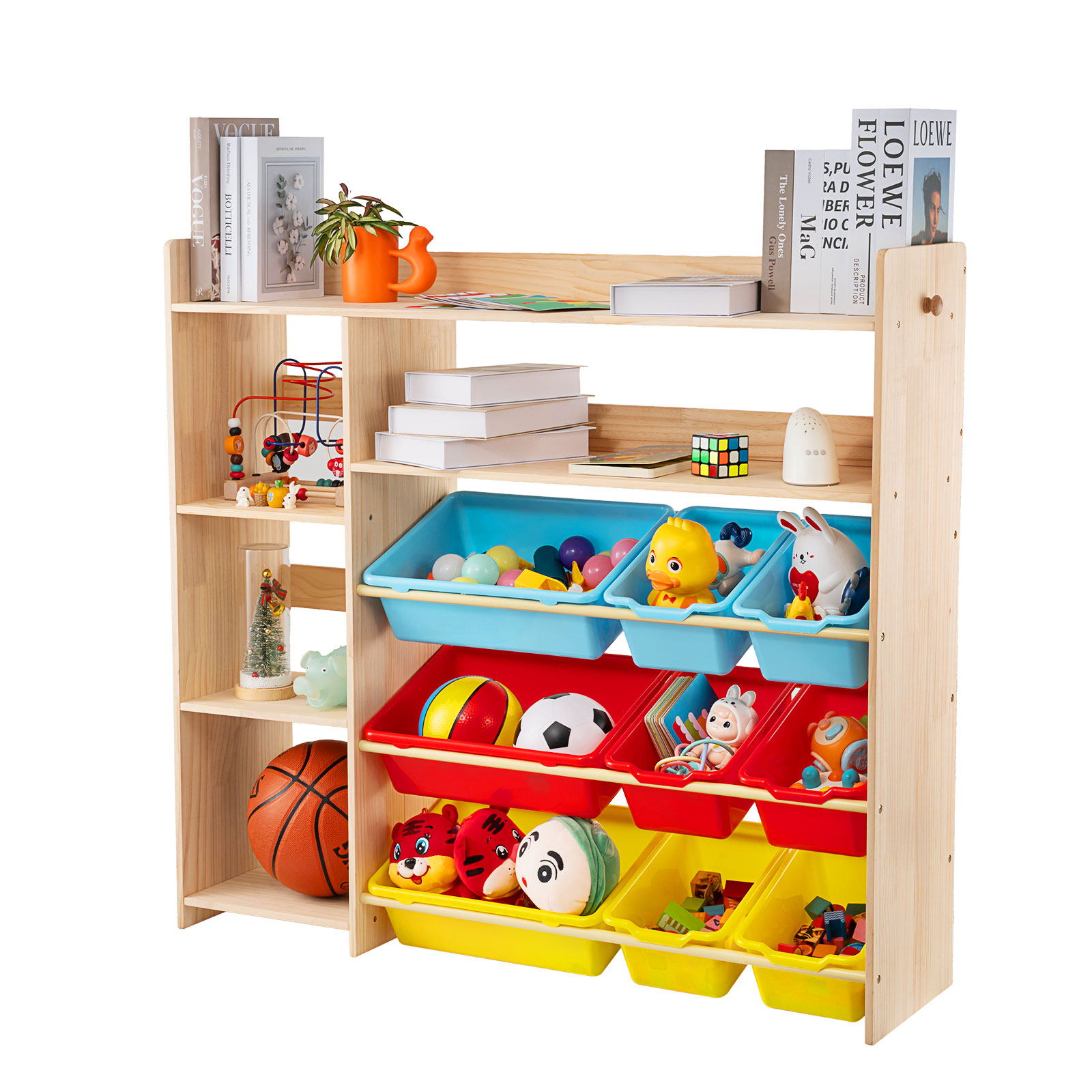 - LARGE STORAGE SPACE - The children's toy storage cabinet has 9 plastic toy storage bins and 4 storage ports.Besides, the topmost wooden board can still be used to store items.Such an extra large storage space allows children to place more things they like, keeping the room clean and tidy, so that children can develop good habits from an early age.