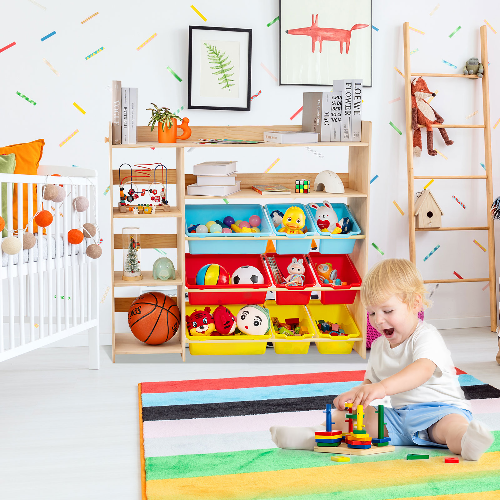 4-Tier Kids' Toy Storage Organizer Shelf - 100% Solid Wood,Children's Storage Cabinet with 9 Plastic Bins and and 3 Storage Ports