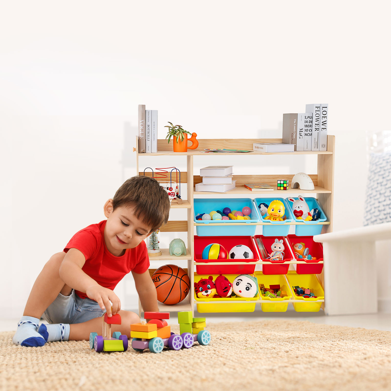 【Multifunction Partition Design】This multifunction storage toy shelves offers a combination of 3 open display shelves, 9 box bins and 3 storage cubbies to provide ample space for the different types of toys, books, stationery, puzzles, and so on. Unlike cubby toy storage, they won’t have to rampage through the closed bins to find their toys. Books scattered on the floor can be neatly grouped on the shelves.