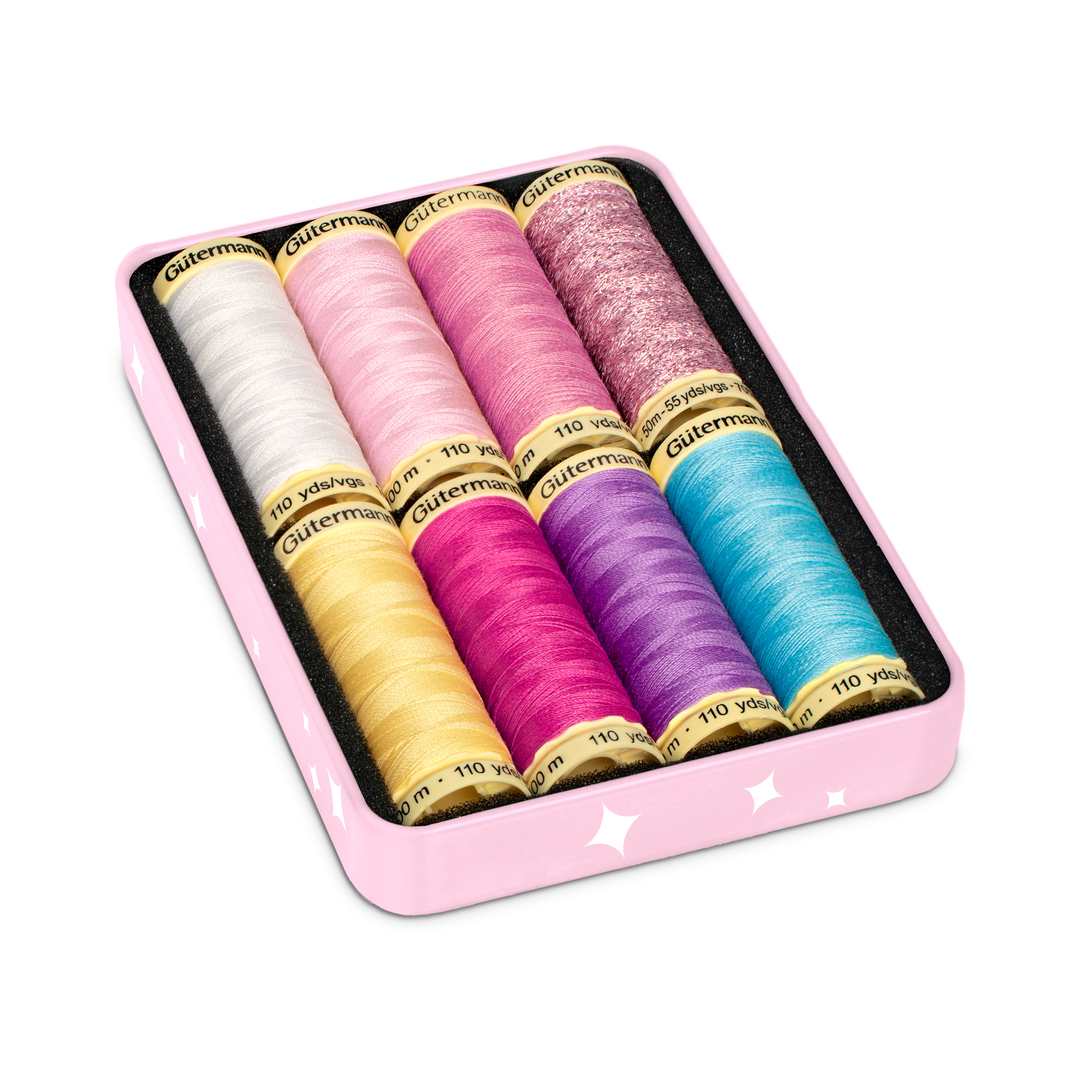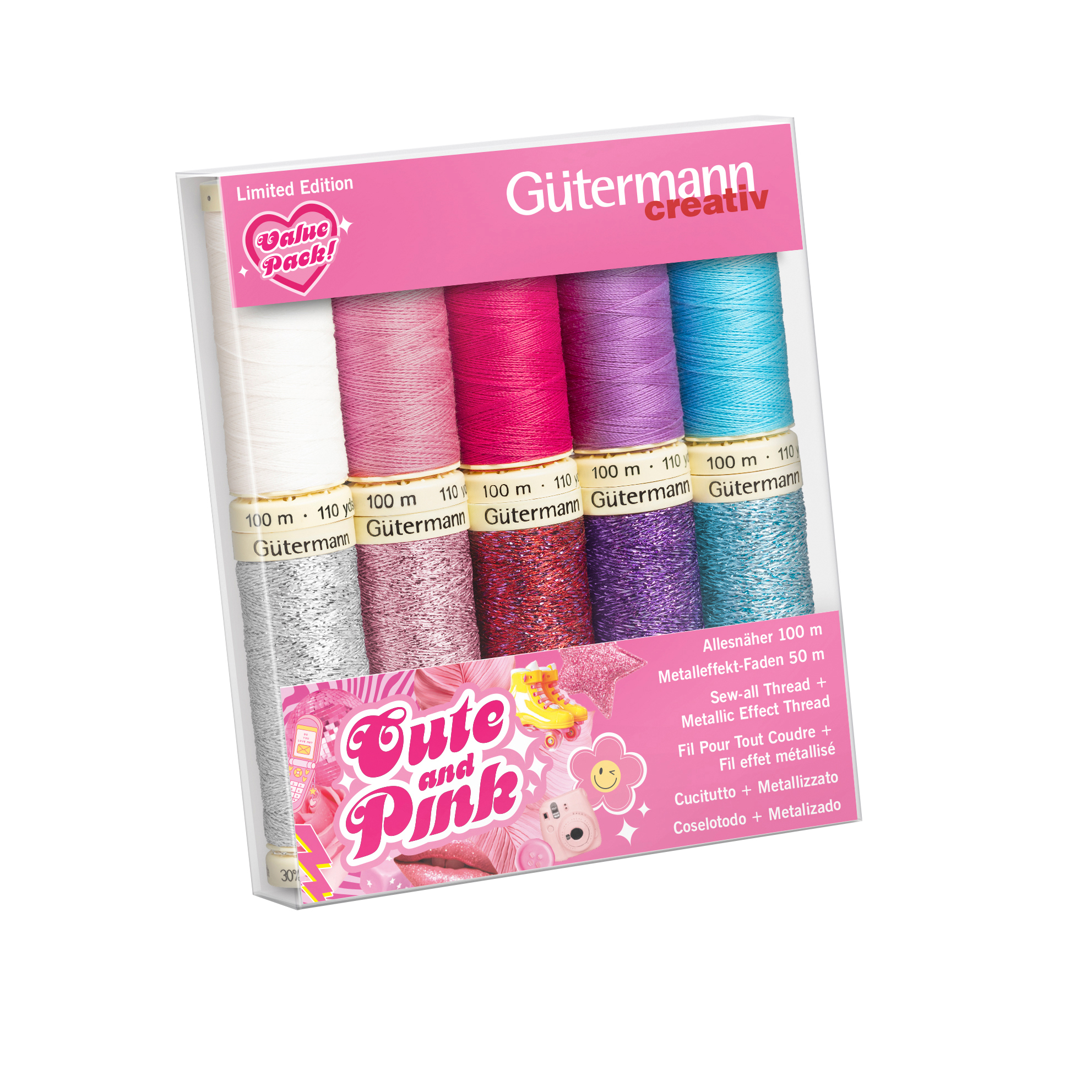 Die Gütermann Cute and Pink-Box ist ein tolles Set aus Aufbewahrungsbox und Nähgarn. Enthalten sind 7 Spulen Allesnäher 100 m und 1 Spule Metalleffekt-Faden W331 mit 50 m. Der Allesnäher ist ein Universalnähfaden, der für schöne und starke Nähte sorgt. Der Metalleffekt-Faden ist der Eyecatcher für funkelnde Effekte. Er eignet sich perfekt für Zierstiche und dekorative Nähte. Das Material ist 100 % Polyester und kann sowohl mit der Nähmaschine als auch von Hand verwendet werden. Er eignet sich für alle Stoffe, Gewebe und viele andere Materialien. Mit der Gütermann Cute and Pink-Box hast du immer das passende Nähgarn zur Hand.