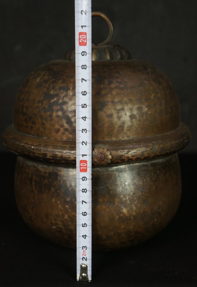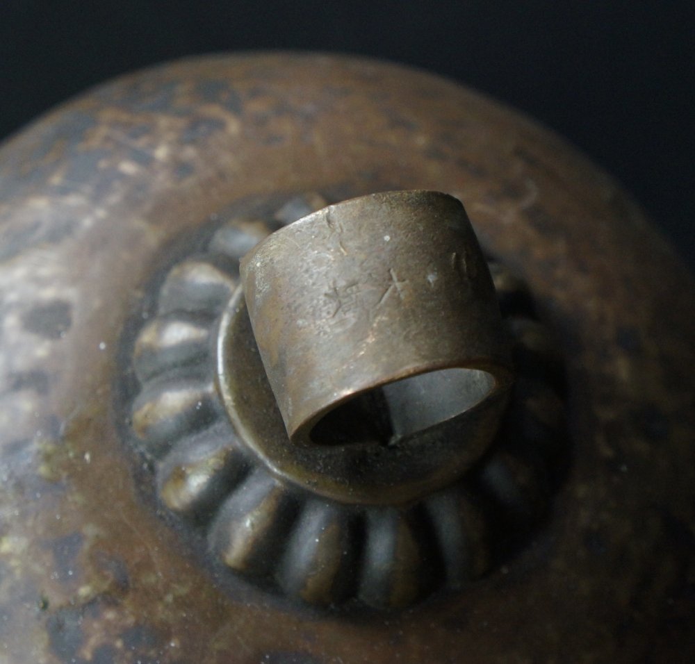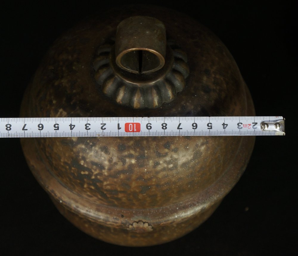 Japanese bronze Dai-Suzu bell for Shinto temple use, nice patina and shape, hand hammered surface, inscription on top ring Daison (大巽). Good conditions, wear from long usage and old restoration visible. Loud rattle sound, immediately usable.