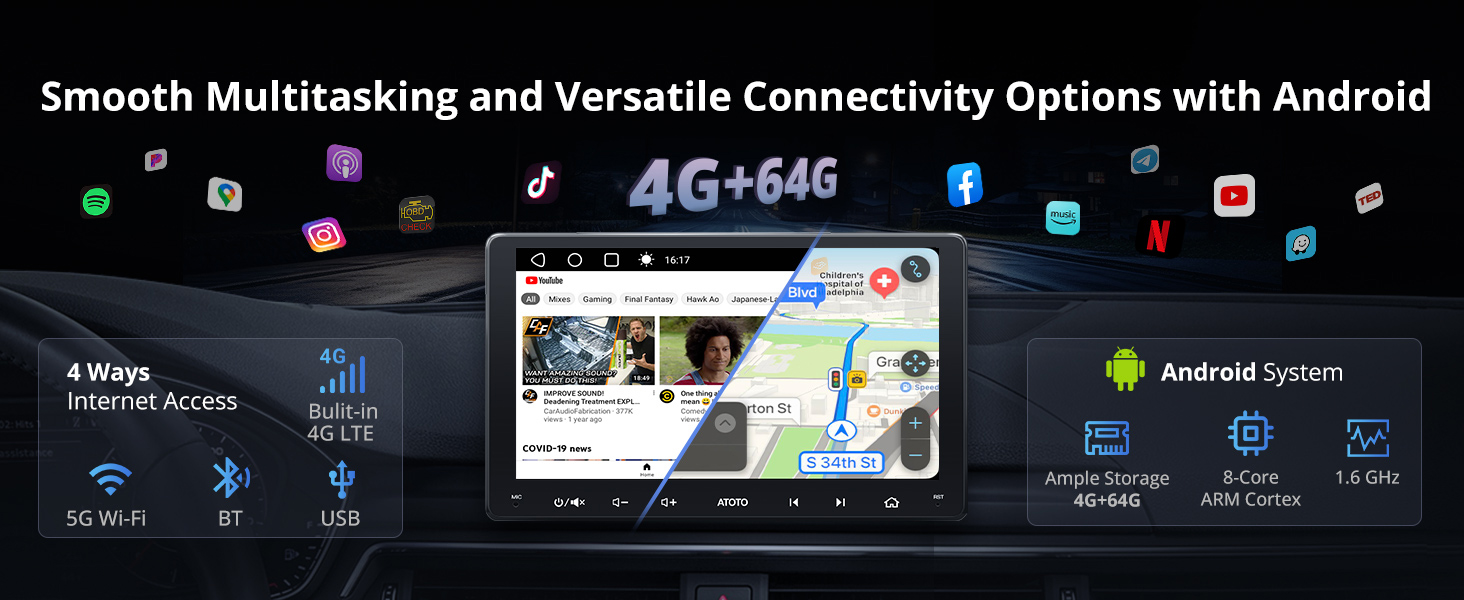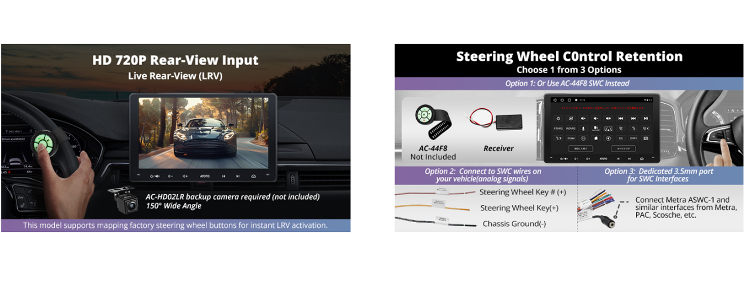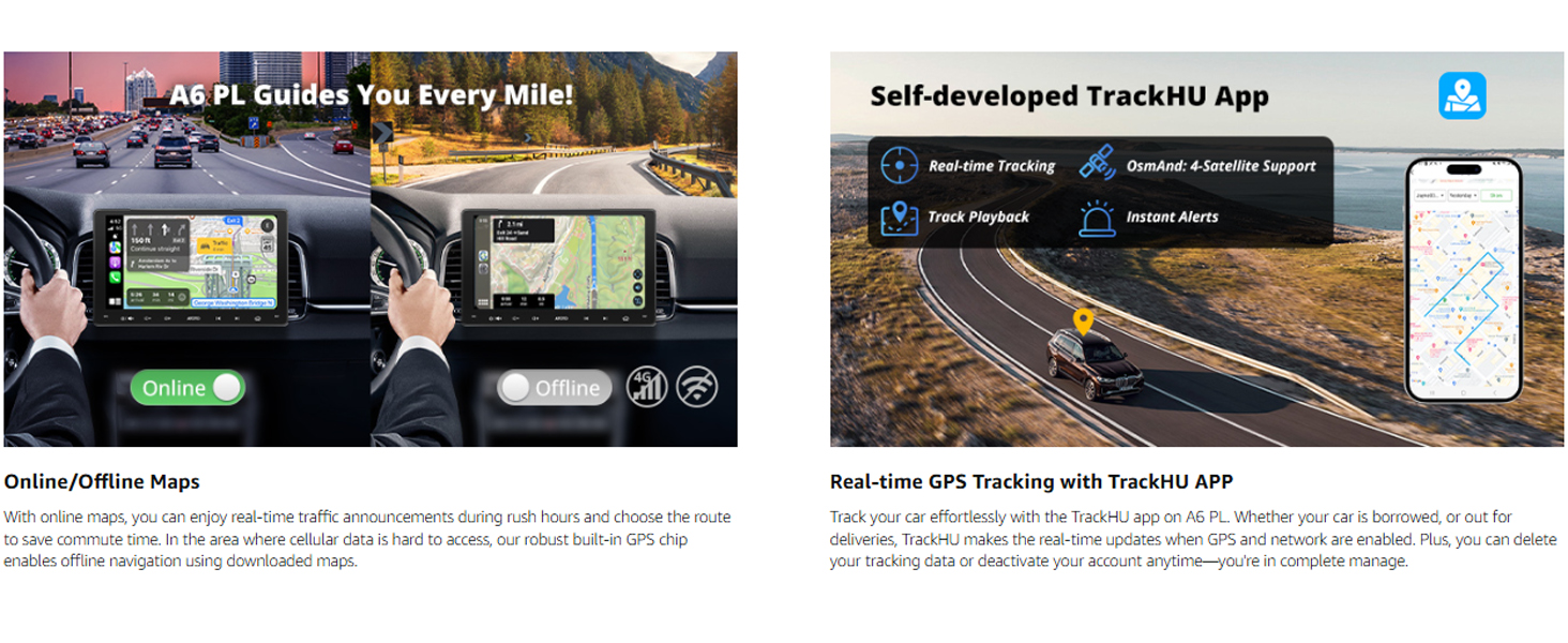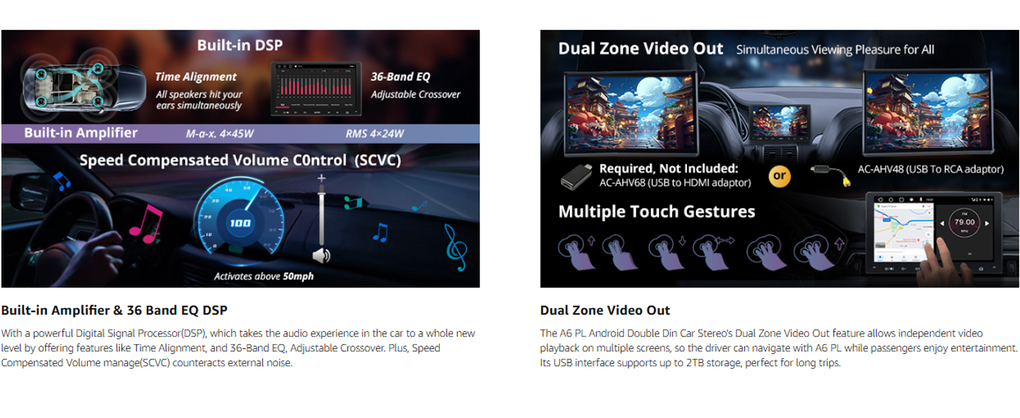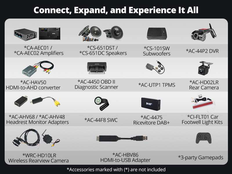 The A6 PL offers extensive connectivity options, allowing seamless integration with various devices and accessories such as CA-AEC01 and CA-AEC02 external amplifiers, CS-651DST and CS-651DC powerful speakers, CS-101SW robust subwoofer, AC-44P2 on dash 1080P DVR camera, AC-HAV50 HDMI converter for screen projection, and AC-4450 BT OBD II, AC-UTP1 USB TPMS tire pressure monitor and even 3-party gamepads. |