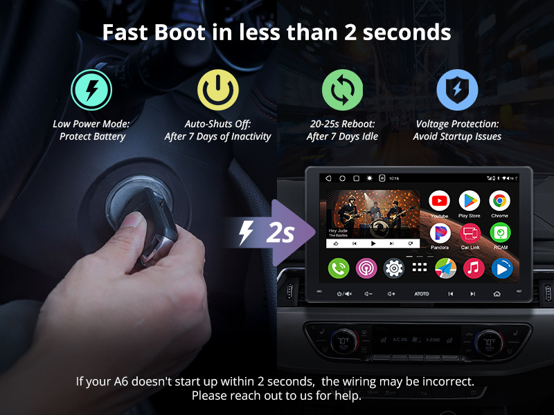 Accelerating the boot time of an Android system from 25 seconds to a mere 2 seconds is challenging. However, it's essential to preserve the car's battery life and ensuring quick startup upon every ignition. This feature has been rigorously evaluated in our products (A6 & S8) to demonstrate its reliability, consistently showing positive results. The internal clock will keep track of time and A6 PF automatically shuts off if the car remains parked after 7 days to save car battery. |
