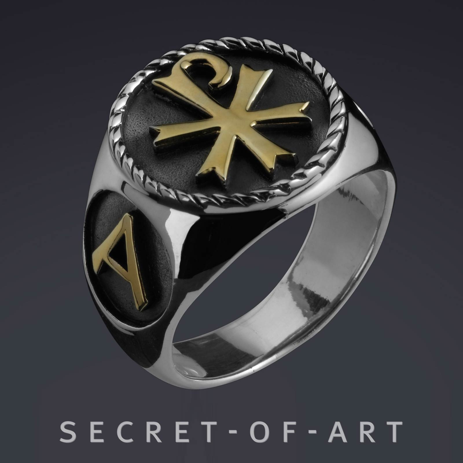 Chi Rho Ring Silber 925 Jesus Alpha Omega 750 Gelbgold-Vergoldung Chi-Ro Ichthys