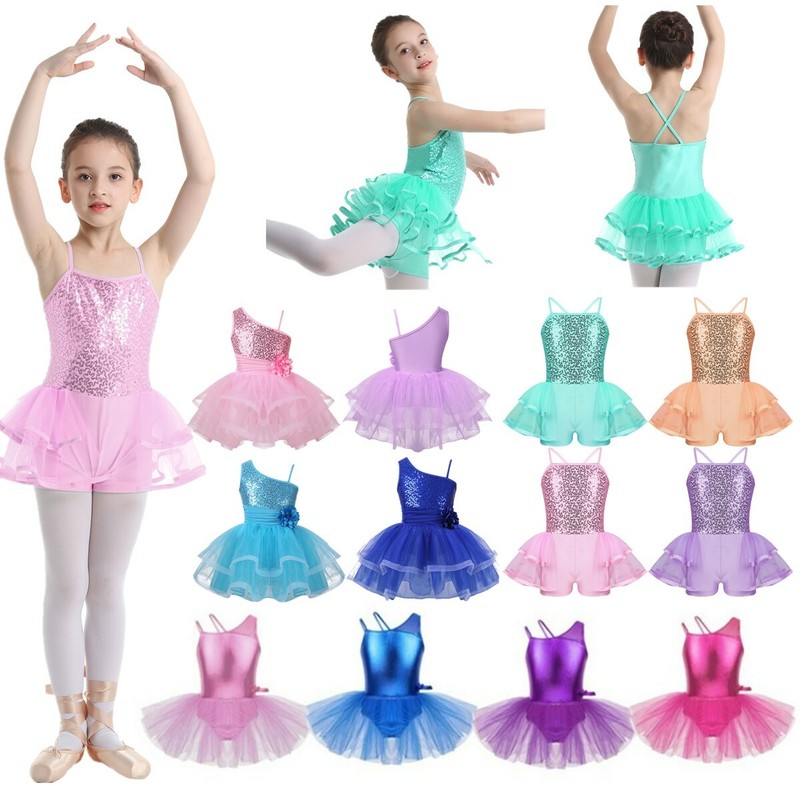 Kids Girls Shiny Sequins Ballet Dance Wear Leotard Tulle Dress Stage Costumes