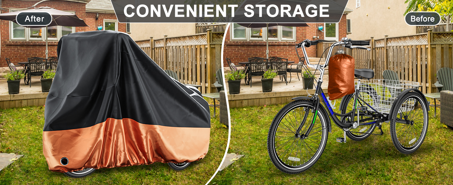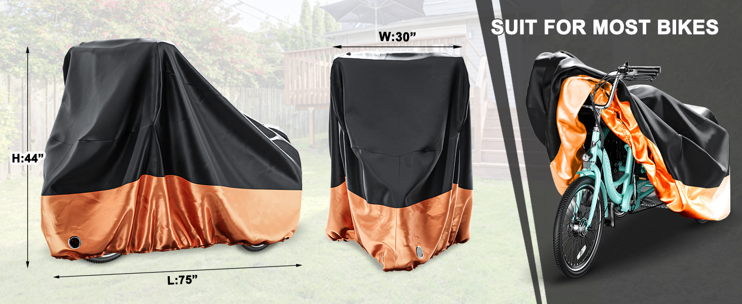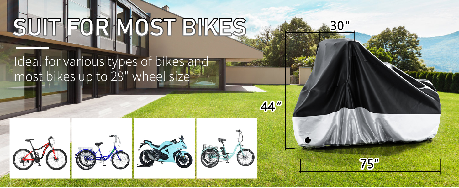 Practical Large SizeWith the extra large dimensions about 75"Lx30"Wx44"H to ensure the cover will fit practically any mountain bike, electric bike, city bike and motorbikes. |