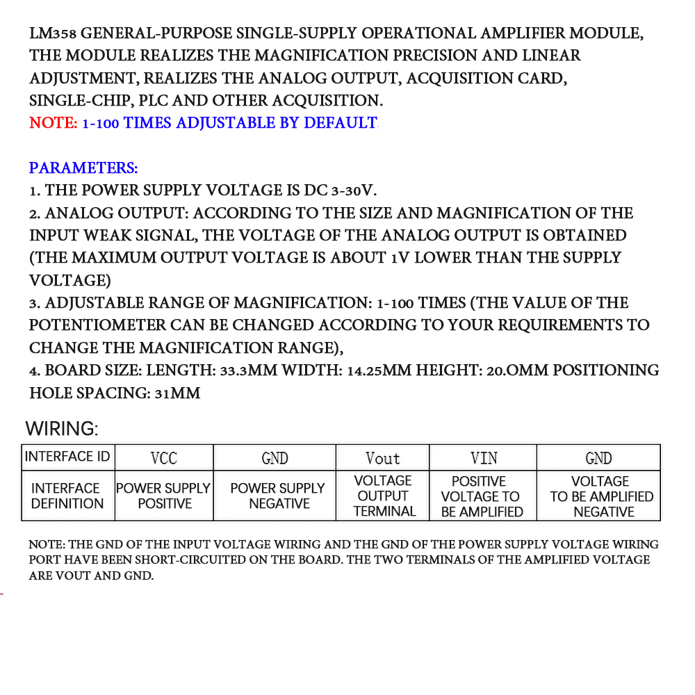 3. Adjustable range of magnification: 1-100 times (according to your requirements, you can change the value of the potentiometer to change the amplification range),