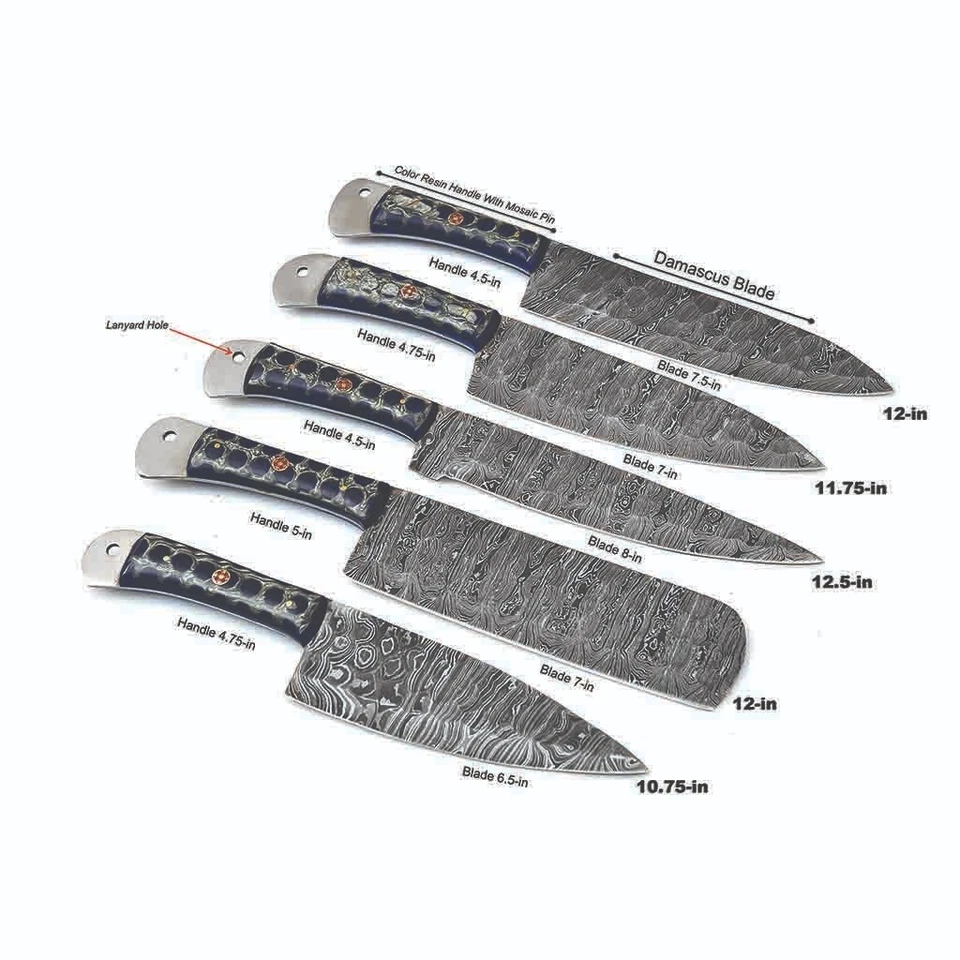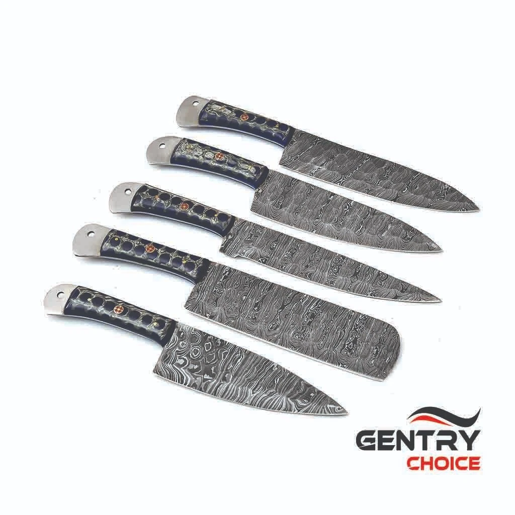 Gentry Choice Damascus Kitchen Knife Set of 5, meticulously crafted by experienced knife-smiths for modern kitchens and professional chefs. This high-quality Damascus steel knife set is hand-forged from 512 layers of layered Damascus steel, treated through a precise vacuum heat process and liquid nitrogen cooling to achieve a Rockwell hardness of 55–58 HRC, ensuring ultra-sharp, long-lasting edges. This chef knife set is adorned with striking blue resin and mosaic handles, finished with brass pins and a lanyard hole for convenient hanging or carrying. The handles are designed for superior comfort and grip, offering well-balanced control that minimizes hand fatigue. The blades feature a manually hammered Damascus twist pattern. Whether you're a professional chef or home cooking enthusiast, this 5-piece Damascus knife set delivers optimal precision for slicing meats, vegetables, fruits, and more. This chef knife set comes with a genuine cowhide leather sheath, ensuring your knives are protected and organized. This handmade Damascus chef knife set with resin handles is an ideal choice for culinary artists, professional kitchens, and cooking lovers seeking both beauty and strength in their tools.