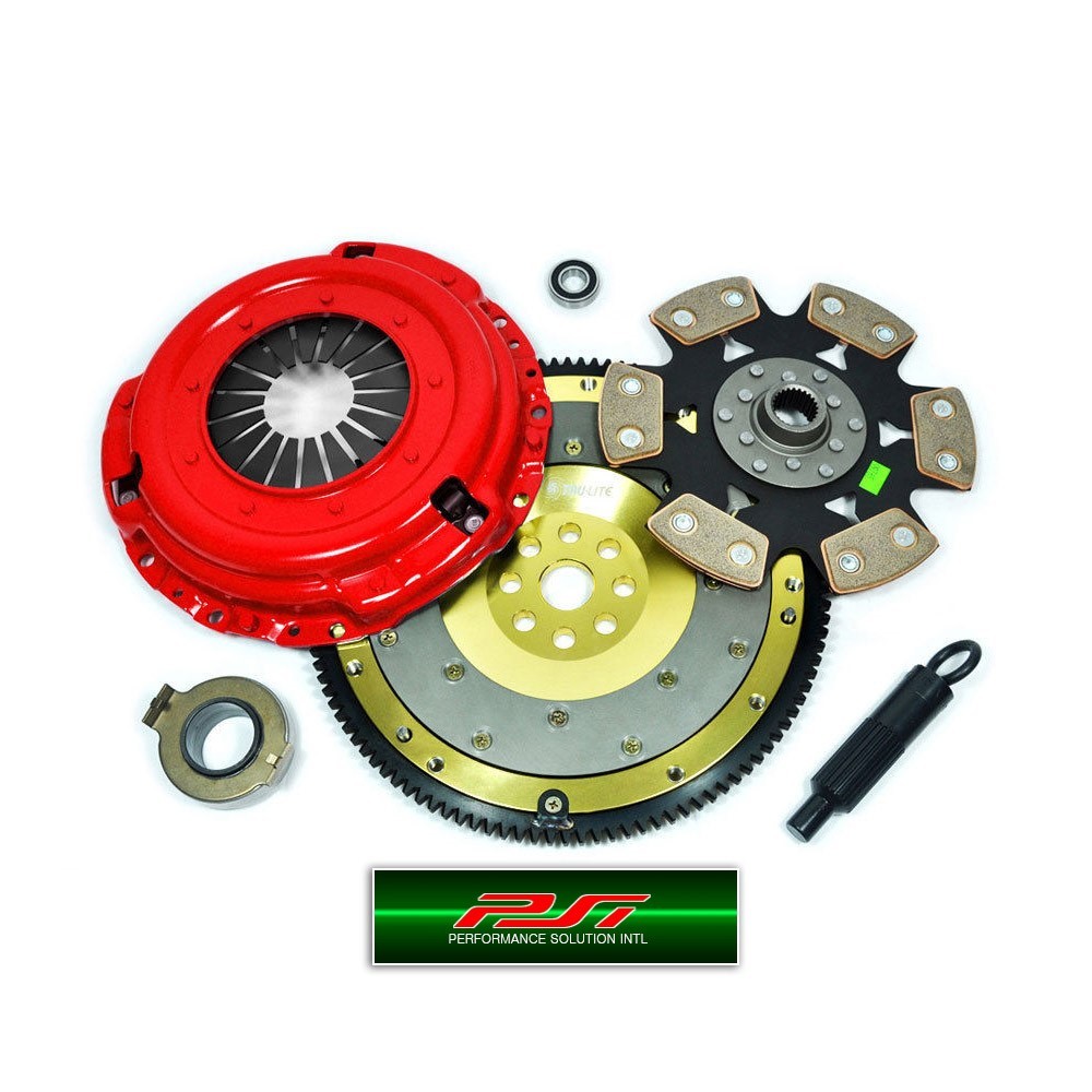 PSI Racing Stage 4 clutches are designed for the individual whose goal is to have an ultimate strip/track clutch system. PSI Racing Stage 4 clutches only consist of the very best materials available. The pressure plate is made from forged ductile iron (stronger than the conventional cast iron pressure plate) to ensure consistent clamping force and extra long life. Virtually indestructible 6-puck solid race discs have a high-capacity center hub for a precise and direct clutch engagement. The 6-puck copper ceramic (also known as 'MIBA') disc features high-coefficient friction pads that are resistant to slippage and burst. The PSI Racing pressure plate features a special single diaphragm design to increase clamp load. It features an induction-hardened diaphragm, CNC machined castings, stronger drive straps and rivets. PSI Racing pressure plates provide a smooth and precise feel with easy modulation. All PSI Racing pressure plates are load tested on a special testing tool for quality assurance.