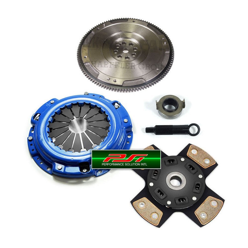 This is brand new PSI Stage 3 Clutch Kit and PSI HD flywheel combo package. PSI Stage 3 clutch kit is a direct factory replacement clutch kit and it's designed for those who seek the ultimate in clutch performance and reliability. PSI clutch kit includes only the highest grade clutch components from the world's leading racing clutch manufacturers. The 4-puck copper ceramic (also known as MIBA) disc features 8 high-coefficient friction pads that are resistant to slippage and ensures long lasting life. The heavy-duty sprung center unit boasts heat treated springs and retainer rivets for the maximum power and durability. The PSI pressure plate features special single diaphragm design to increase clamp load. It features induction hardened diaphragm, CNC machined castings, stronger drive straps and rivets. PSI pressure plate provides smooth and precise feel with easy modulation. All PSI pressure plate is load tested on a special testing tool for quality assurance.